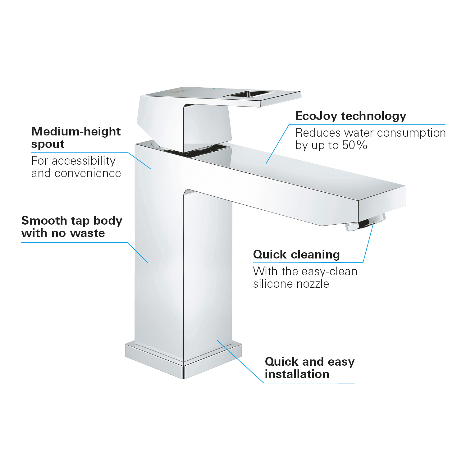 GROHE Eurocube wastafelkraan – karakteristiek design en medium uitloop Voor liefhebbers van een modern en strak design die hun keuken of badkamer een kenmerkende uitstraling willen geven, heeft GROHE de Eurocube serie ontworpen. Dankzij het bekroonde design en de kenmerkende Duitse techniek van GROHE beschikken de keukenkranen, badkamerkranen, douches en accessoires werkelijk over een vierkant design. Maak een echt stijlstatement met GROHE Eurocube.