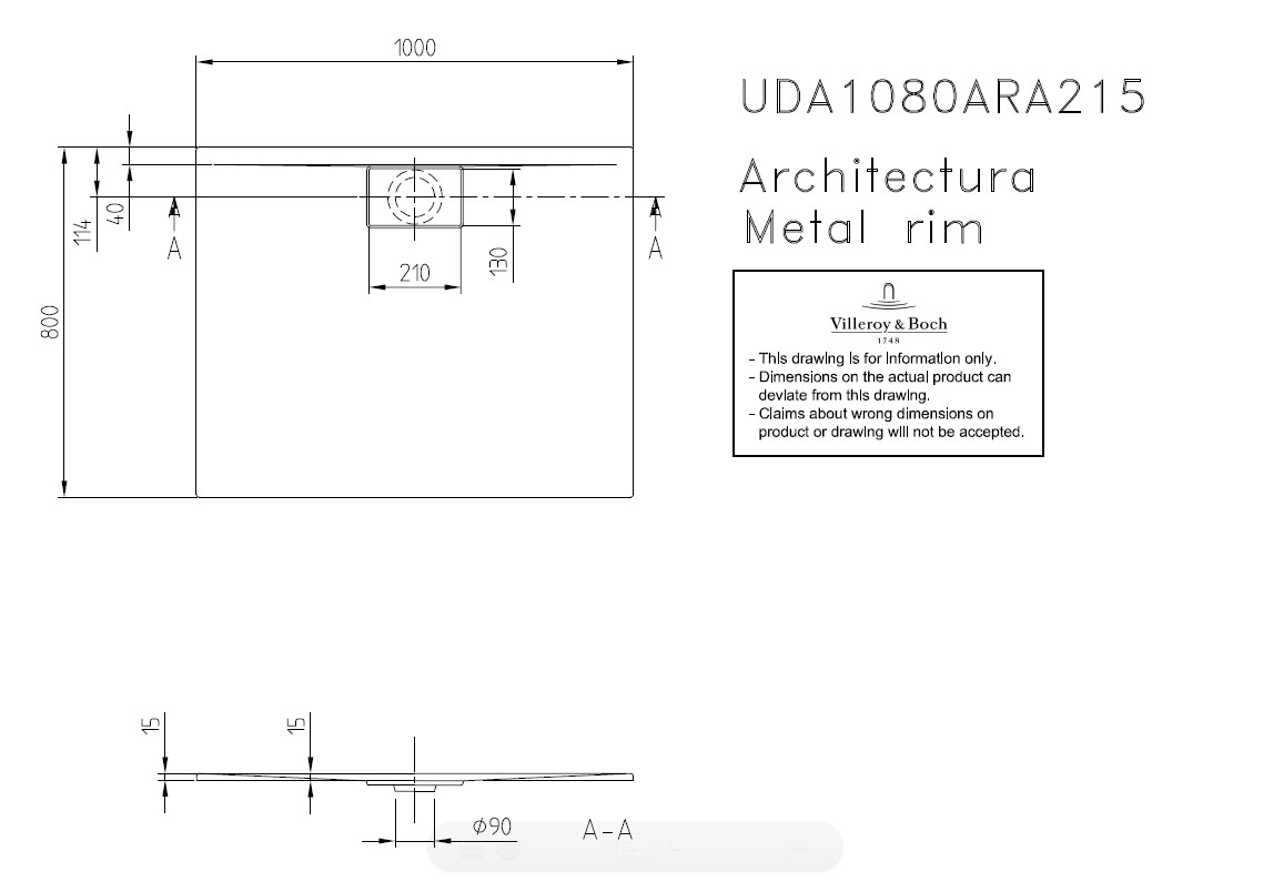 Villeroy & Boch Architectura Metalrim douchebak acryl rechthoekig 100x80x1.5cm alpine wit 1024717