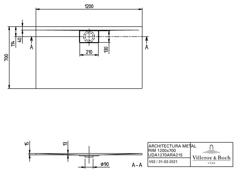 Villeroy & Boch Architectura Metalrim douchebak acryl rechthoekig 120x70x1.5cm alpine wit 1024721