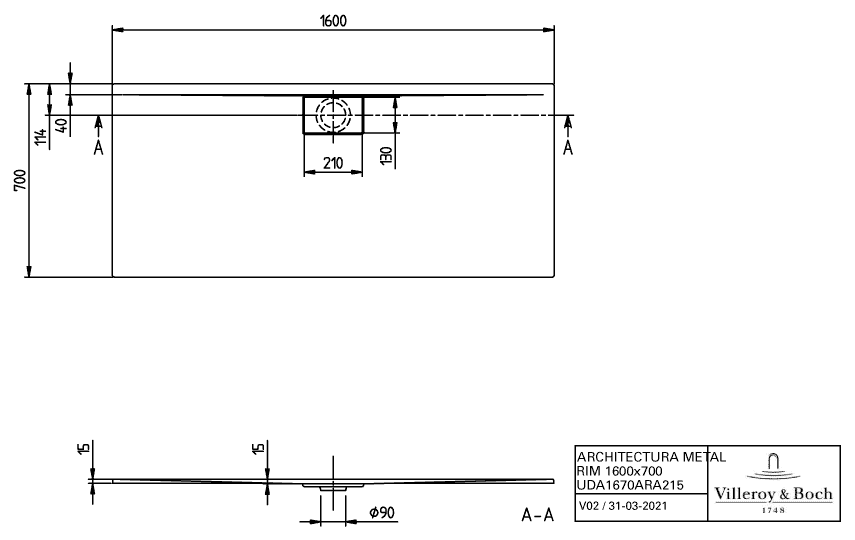Villeroy & Boch Architectura Metalrim douchebak acryl rechthoekig 160x70x1.5cm alpine wit 1024743