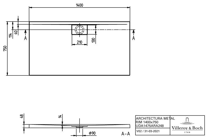 Villeroy & Boch Architectura Metalrim douchebak acryl rechthoekig 140x75x4.8cm alpine wit