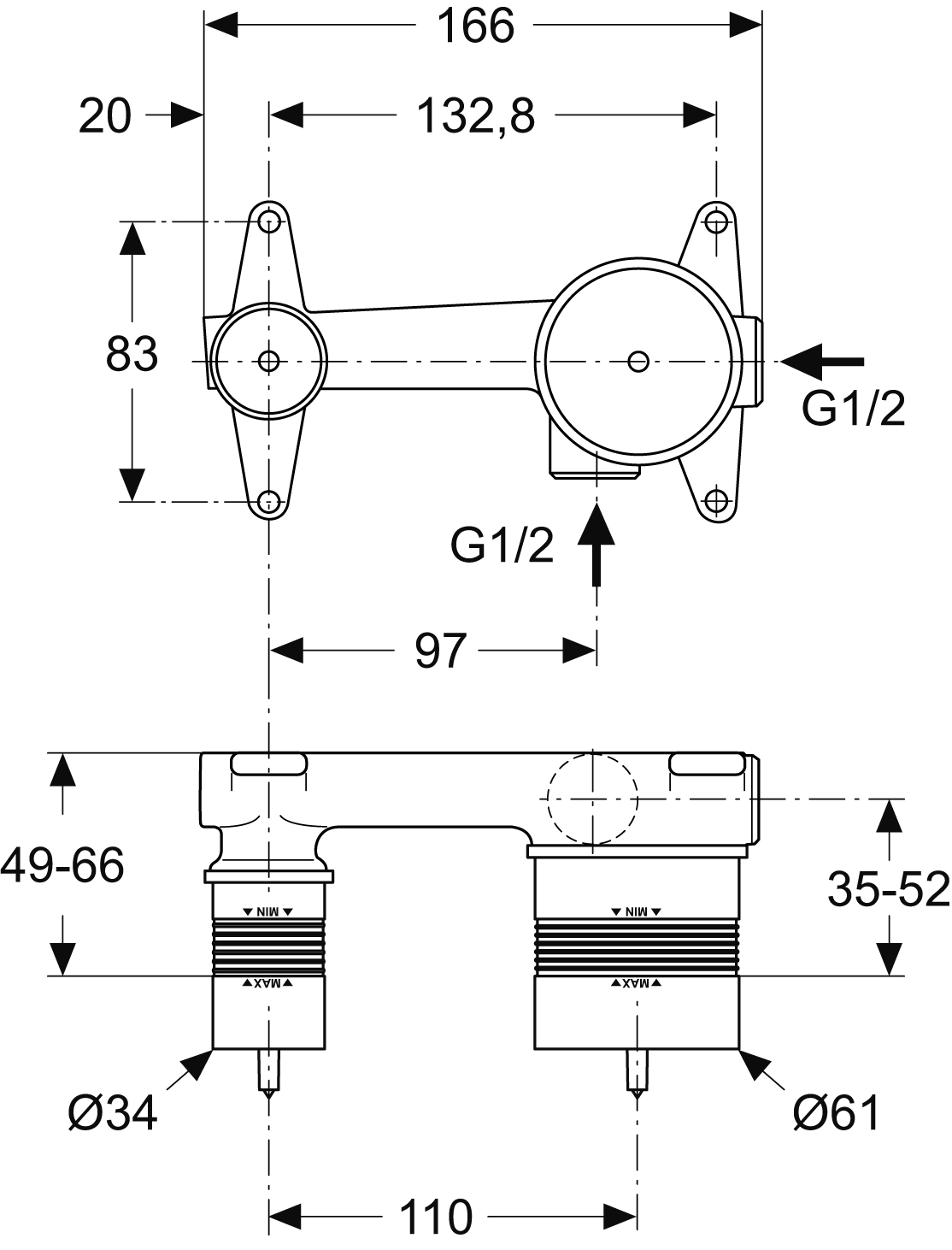 Ideal Standard inbouwdeel voor 2 gats wandkraan chroom