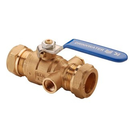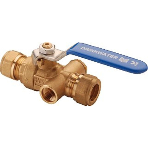 Raminex S28 Kiwa kogelkraan met aftapgelegenheid knel messing 15x15mm dn15 kiwa hendel blauw