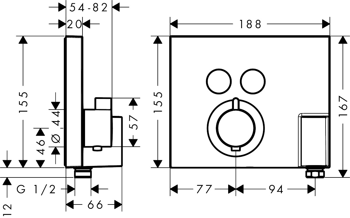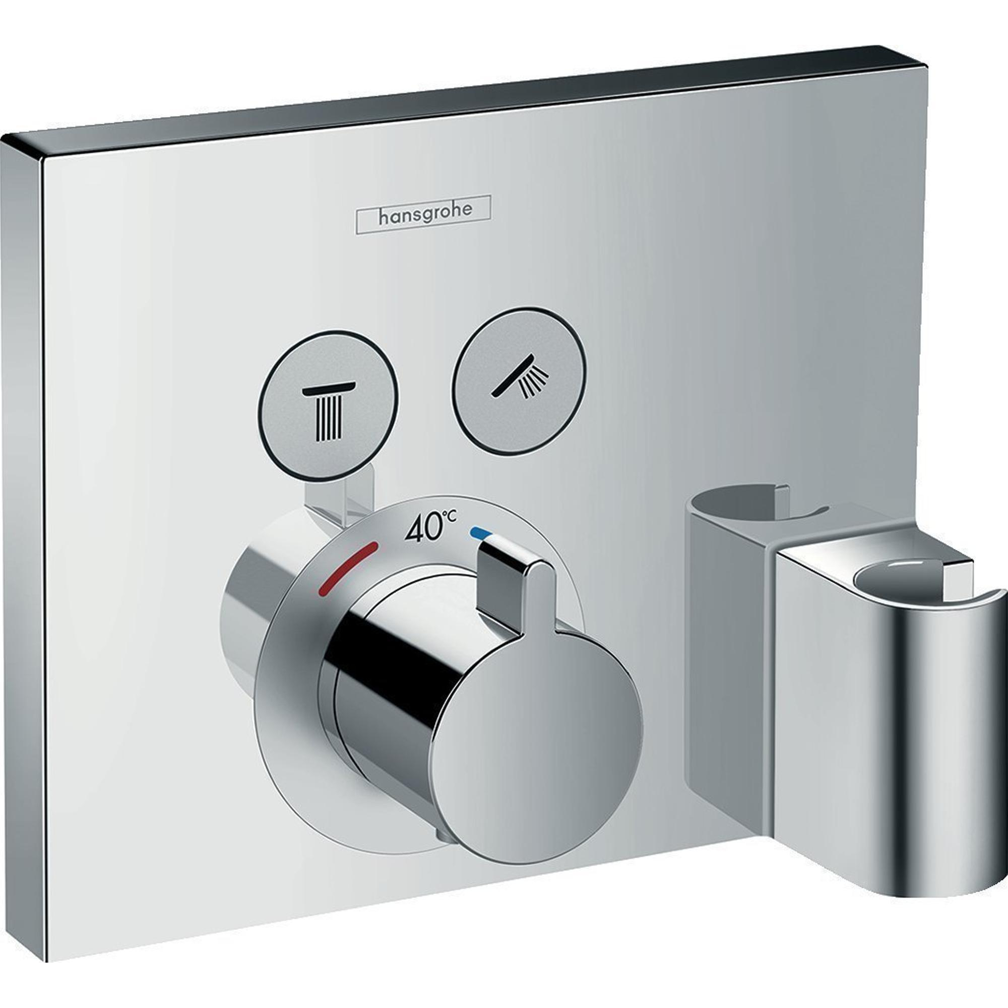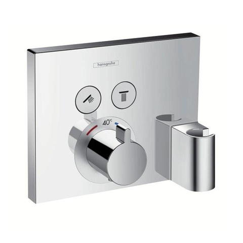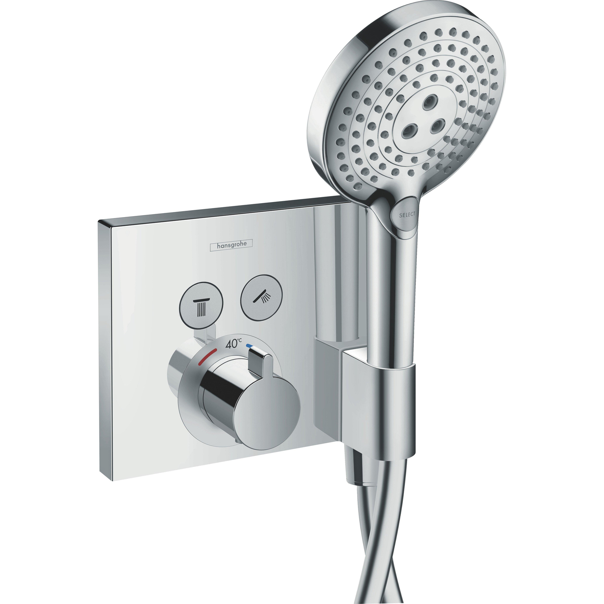 Met de Select-knop wordt de kraan aan- en uitgezet. Het duurzame binnenwerk zorgt ervoor dat de kraan veilig en duurzaam functioneert. Dankzij de temperatuurbegrenzing van veertig graden voorkom je een te hete douche. Afbouwdeel ShowerSelect inbouw thermostaat met stopkranen voor twee douchefuncties. Afmetingen: 192 x 284 x 213 mm. Installeren in combinatie met een apart te bestellen inbouwdeel. Duurzaam doordat hij maximaal 26 liter water per minuut doorlaat . Met de Safetyfunctie bepaal je zelf de maximale temperatuur van het water zodat je veilig kunt douchen. Select - Met een druk op de knop wissel je tussen drie verschillende straalsoorten.De verschillende functies van deze douchethermostaat kunnen gelijktijdig gebruikt worden. De thermostaat is voorzien van een ingebouwde douchehouder. Dankzij de temperatuurbegrenzing kun je jezelf nooit meer verbranden door een te hete douche.