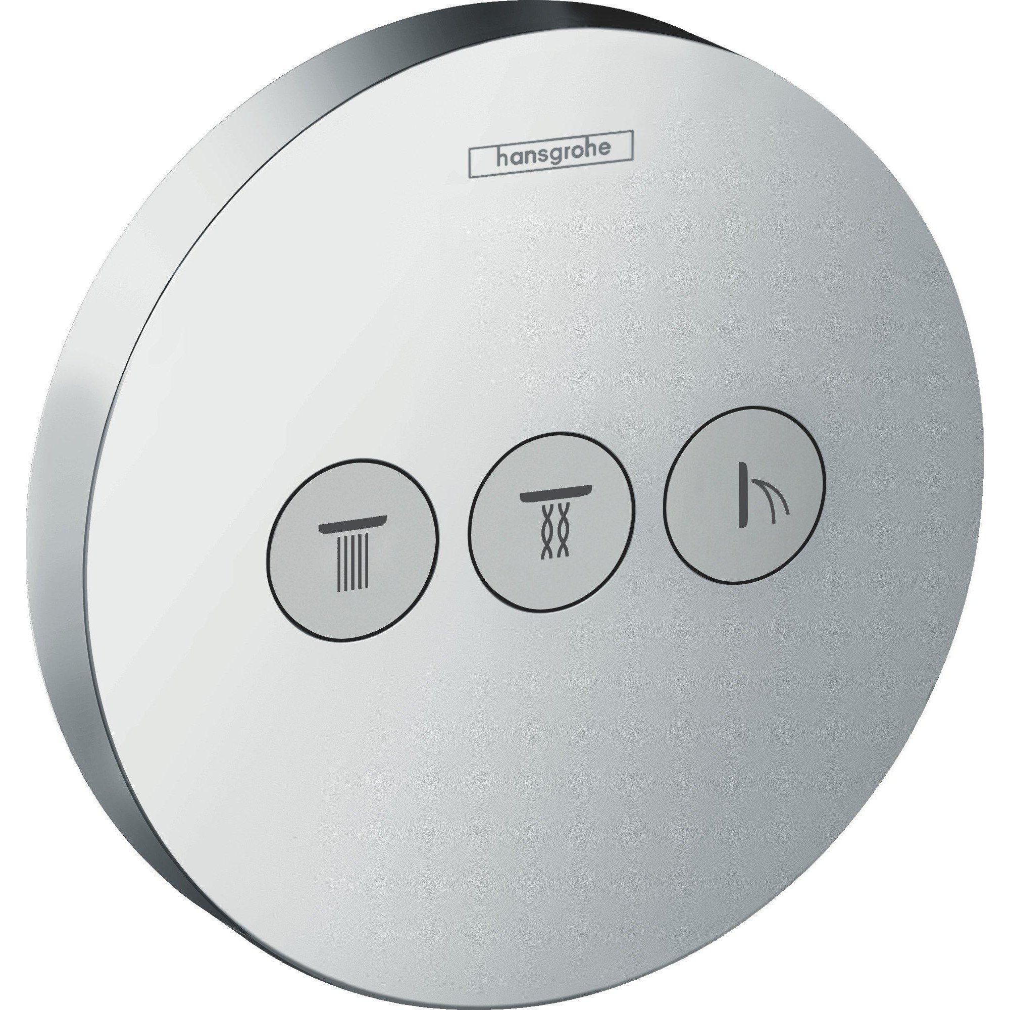 Het afbouwdeel ShowerSelect inbouw stopkraan voor drie functies laat je afwisselen tussen drie fijne waterstromen. Het ronde chromen dekplaatje behuist drie duidelijke selectieknoppen die tegelijk gebruikt kunnen worden. Met dit stijlvolle en gebruiksvriendelijke deel bouw je de douche helemaal af. De verschillende functies kunnen tegelijkertijd gebruikt worden. Met een maximale doorstroom van 43 liter water per minuut is dit geen probleem. Door een Select-knop in te drukken zet je de douche aan of uit. Afbouwdeel ShowerSelect inbouw stopkraan voor 3 functies. De verschillende functies kun je gelijktijdig gebruiken. De kraan laat maximaal 43 liter water per minuut door. Je installeert de kraan met een apart te bestellen inbouwdeel. Select - Met een druk op de knop wissel je tussen drie verschillende straalsoorten.Je kiest eenvoudig voor de fijnste douchestand met de overzichtelijke knoppen. Je kunt de verschillende functies gelijktijdig gebruiken. Het binnenwerk is gemaakt van duurzaam materiaal.