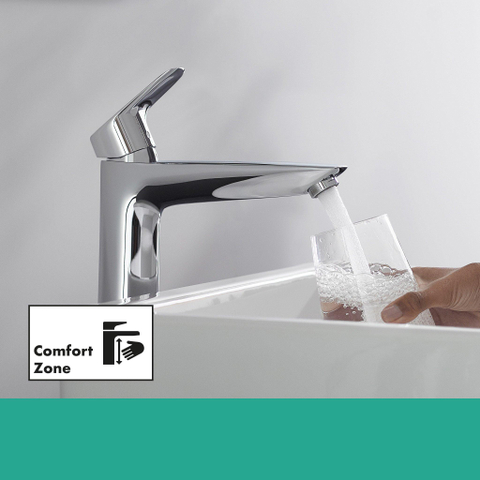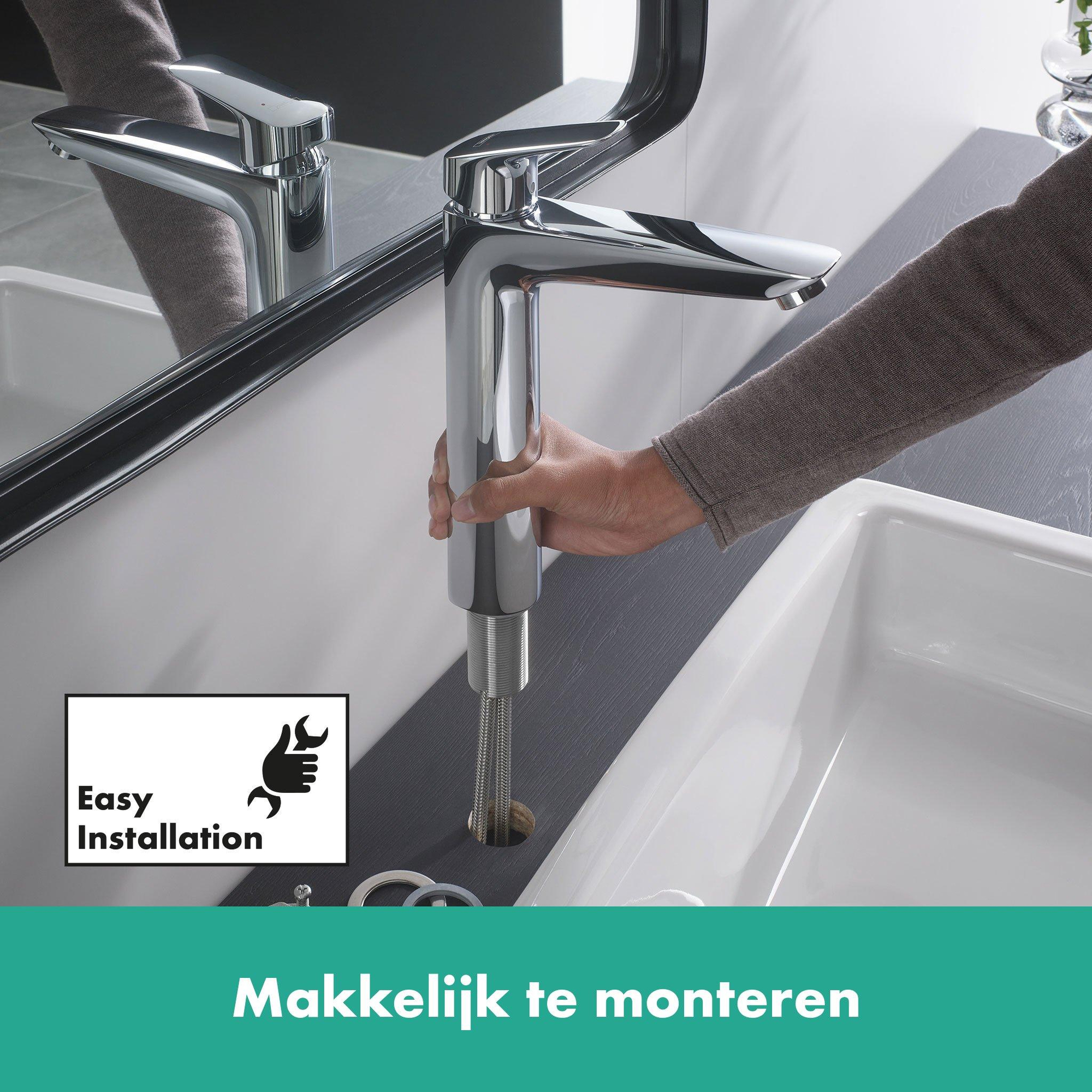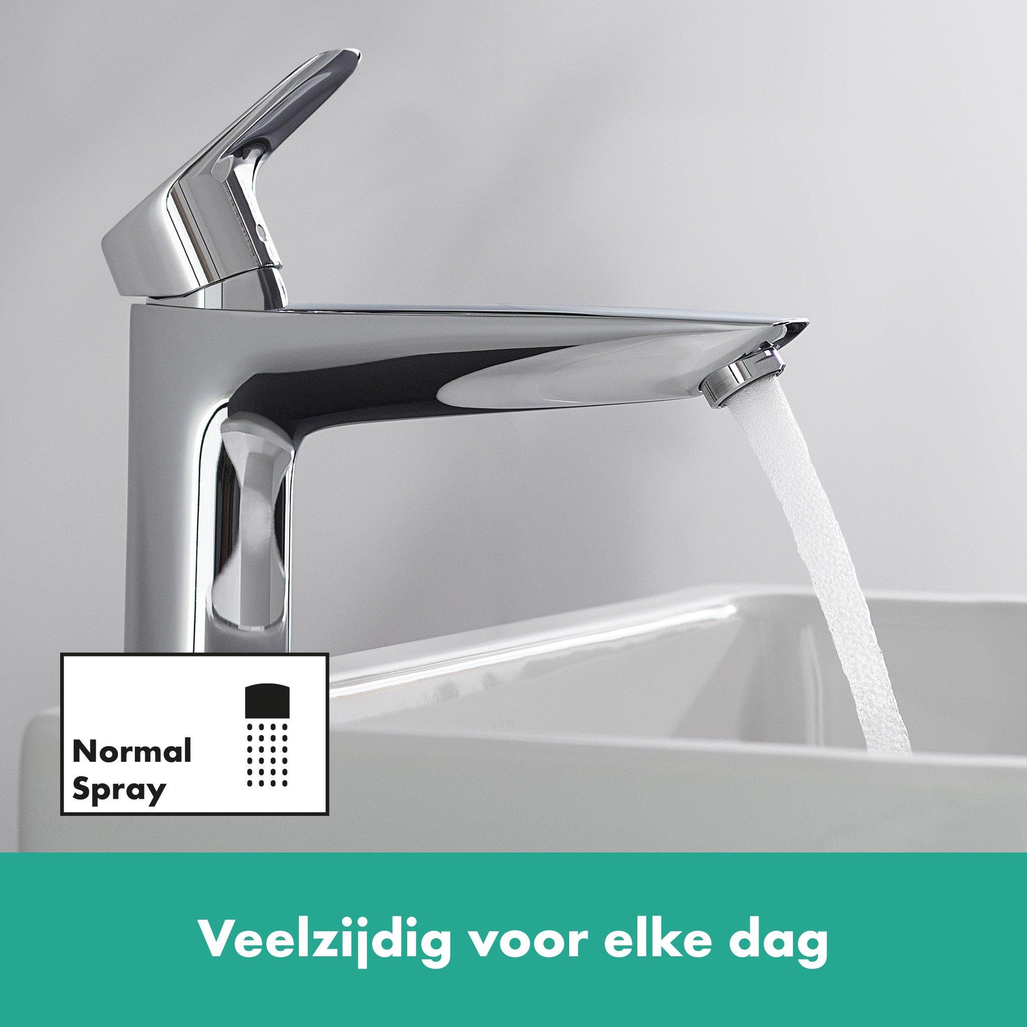 De ééngreeps wastafelmengkraan Logis 190 met trekstang-afvoerset van hansgrohe overtuigt direct in driedubbel opzicht: De 190 mm hoge badkamerkraan met grote afstand tussen uitloop en fontein zorgt voor een bijzonder flexibel dagelijks gebruik (ComfortZone 190). Onder deze kraan kan gemakkelijk het haar worden gewassen of kunnen grote pannen worden gevuld. Het SoftCube-design van de Logis-kranen met hun royale, overspannen chroomfinish straalt kwaliteit uit. Met hun eigentijdse en tegelijkertijd eenvoudige vormgeving vormen de kranen een harmonieuze aanvulling op een breed scala aan badkameromgevingen. Net als alle badkamerkranen uit het logische productassortiment overtuigt ook deze ééngreeps wastafelmengkraan met zijn aantrekkelijke prijs-kwaliteitverhouding.