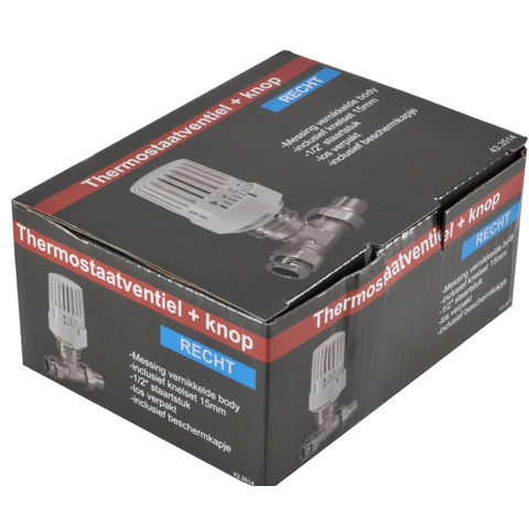 inclusief thermostaatknop en knelsetje 1/2"x15mm. Verpakt in full-color doosje , de kraan heeft een beschermkapje, waarmee deze afgesloten kan worden.