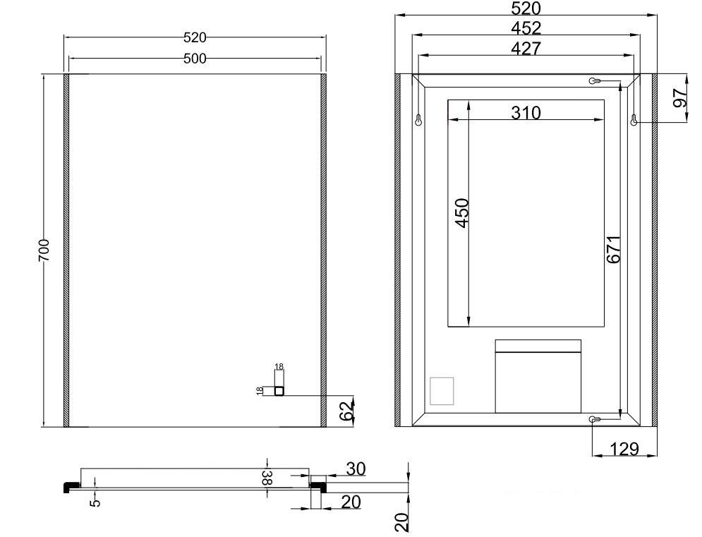 Voorzien van een spiegelverwarmings-mat van 250x350mm ter voorkoming van condensvorming