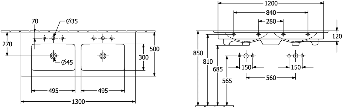 Villeroy & Boch Venticello Wastafel - 130x50cm - 2 kraangaten - overloop - wit