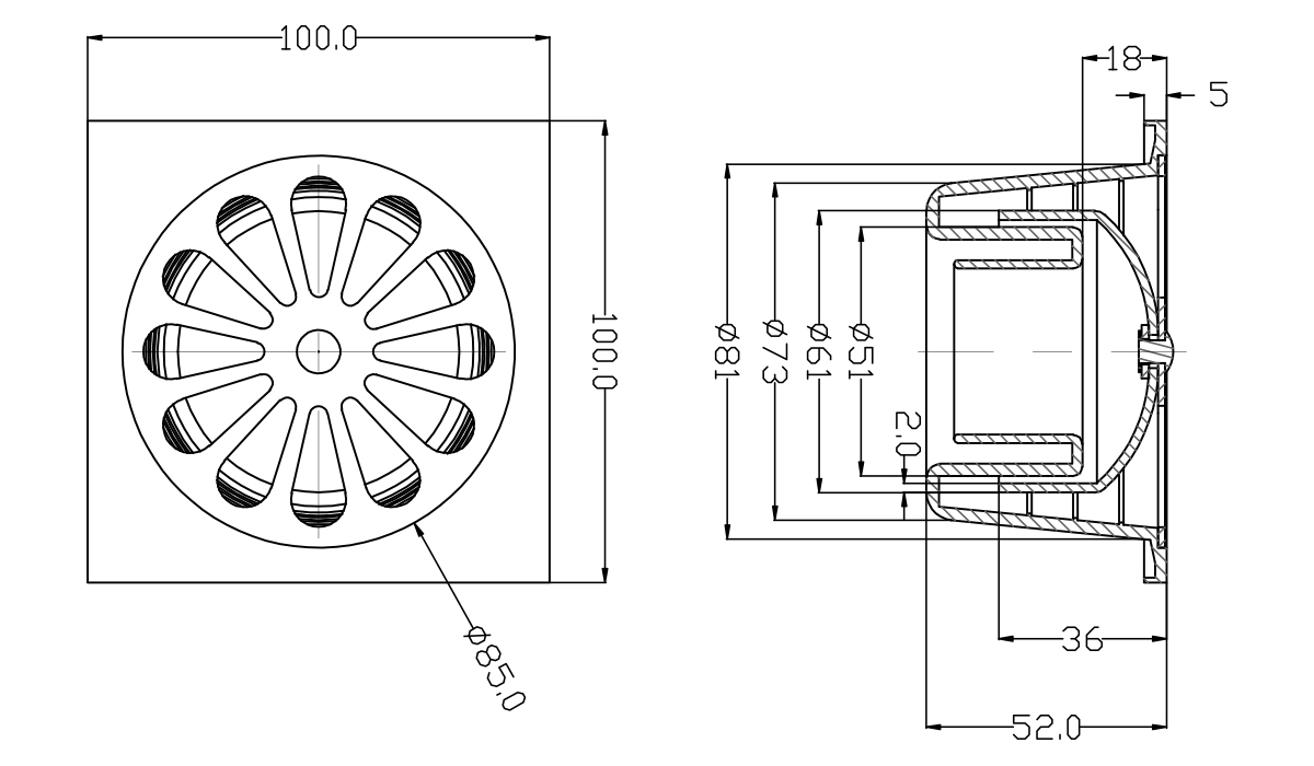 Riko doucheput met onderuitlaat 10 x 10 cm chroom