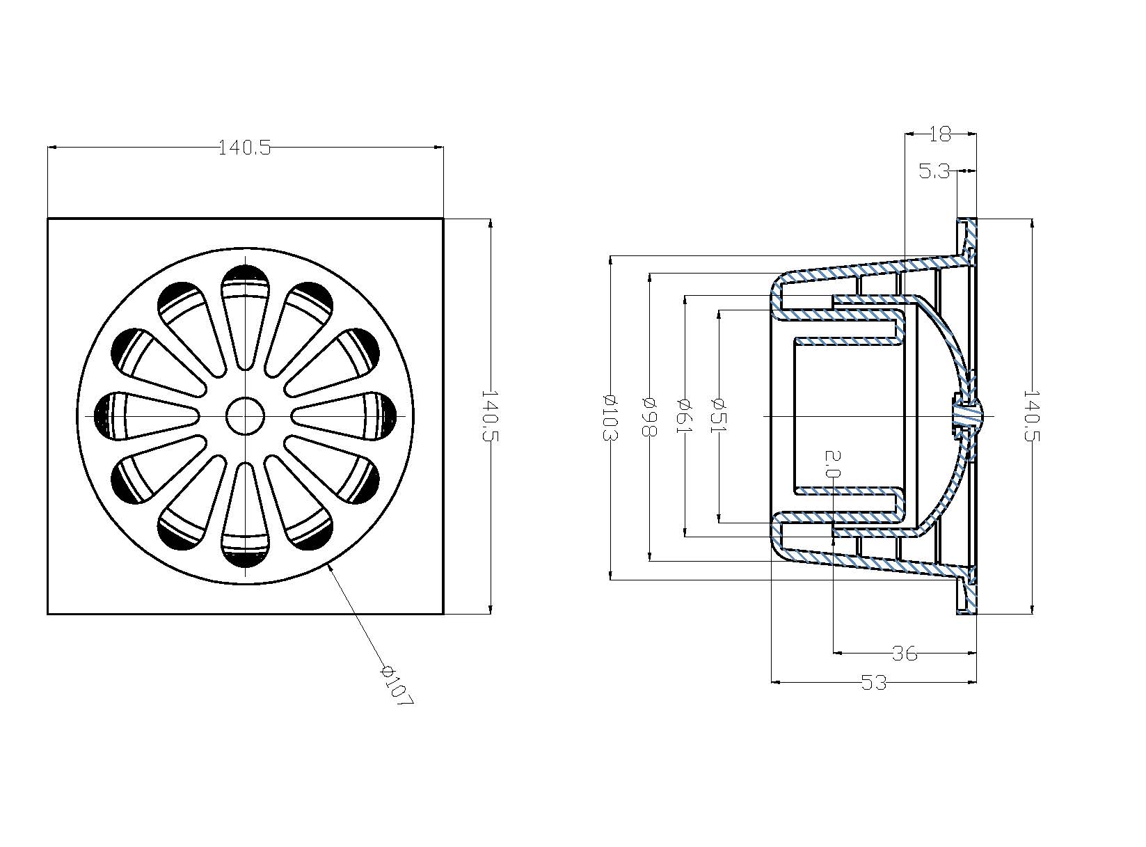 Riko doucheput met onderuitlaat 14 x 14 cm chroom
