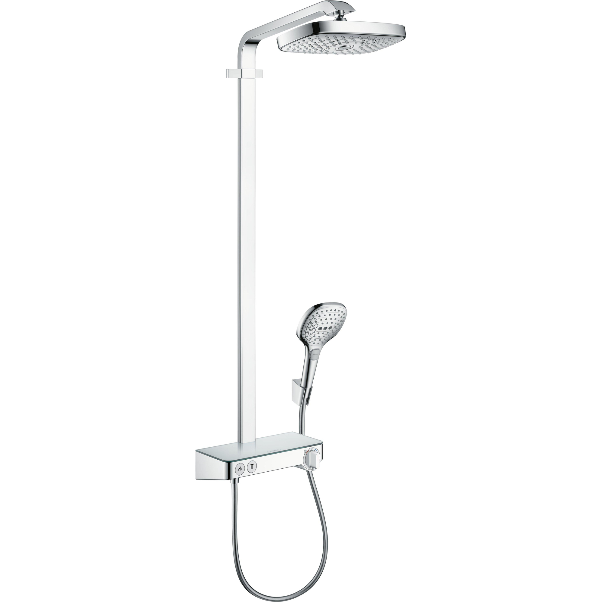 Hansgrohe Raindance Select E 300 2jet showerpipe EcoSmart: met Showertablet 300 opbouwkraan thermostatisch met Raind. Select E 120 3jet handdouche en hoofddouche 2jet chroom