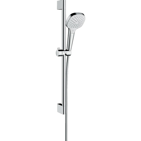 De doucheset Croma Select E Vario 9l verwent met veel comfort bij het douchen en bespaart dankzij de moderne handdouche van hansgrohe ook nog water. De doorstroom wordt automatisch beperkt tot max. 9 l/min, ook bij hoge waterdruk (EcoSmart) De eenvoudige keuze uit de drie straalsoorten zorgt voor comfort: er kan direct aan de handgreep met een druk op de knop worden gewisseld (Select). Naast de handdouche bevat de complete set een originele Unica-glijstang en een 1,60 m lange doucheslang. De schuif op de glijstang (0,65 m) is traploos in hoogte en 45° schuin te verstellen.