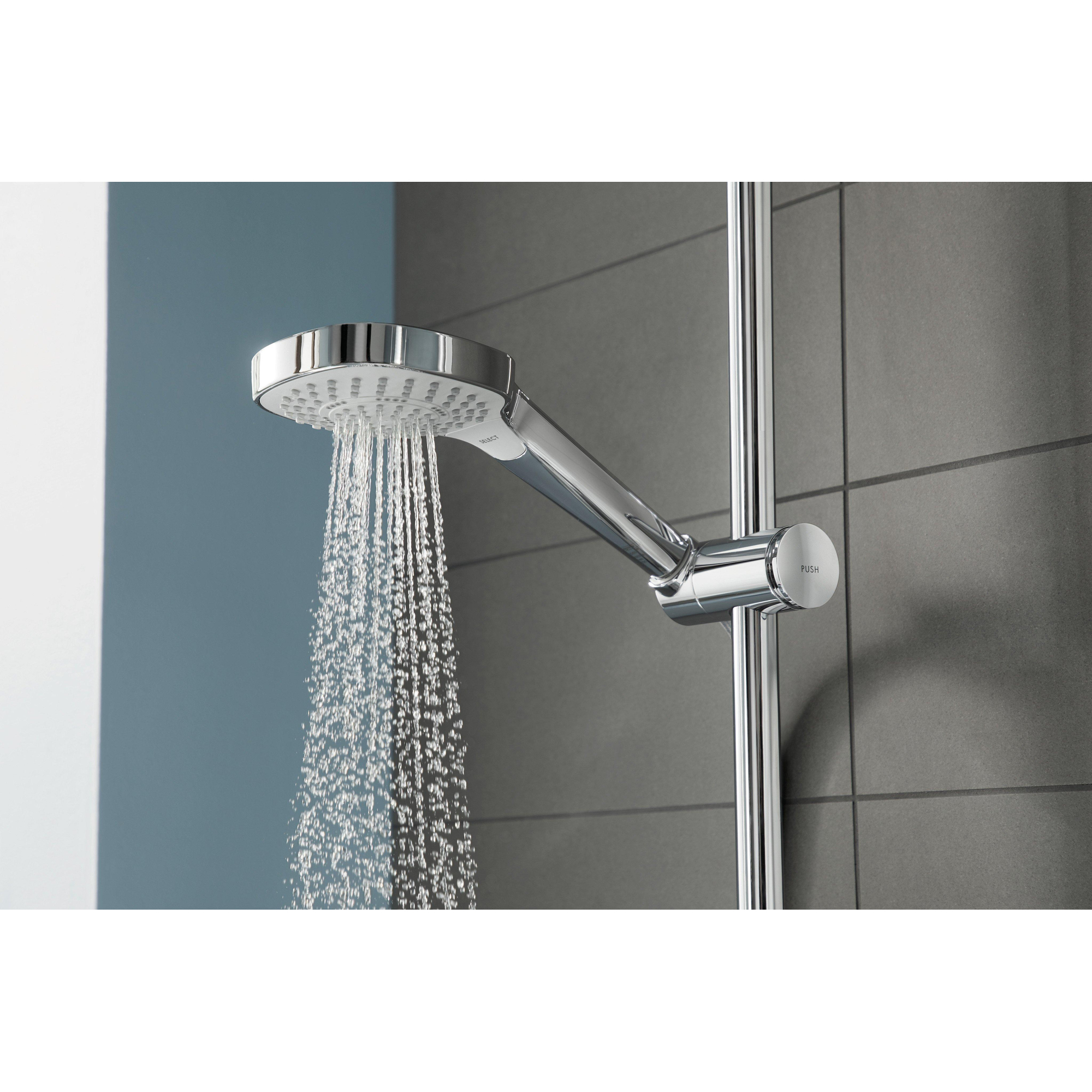 De doucheset Croma Select E Multi verwent met vele details die het douchen aangenamer maken. Zo heeft hansgrohe het wisselen van de straalsoorten gemakkelijk bereikbaar in de douchekop geplaatst. Gewoon met een druk op de knop (Select). Bovendien bespaart de moderne handdouche ook nog water. De doorstroom wordt zelfs bij een hoge waterdruk automatisch begrensd op maximaal 9 l/min (EcoSmart).