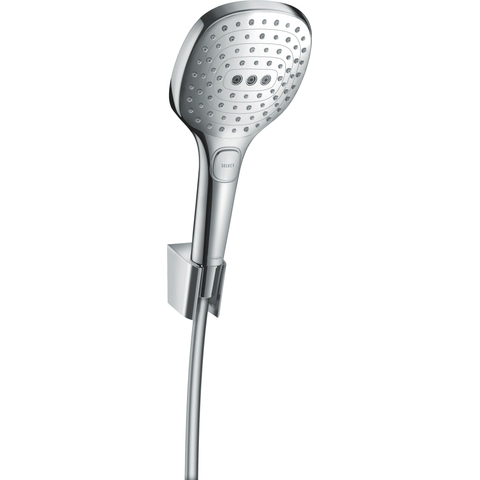 De douchehouderset Raindance Select E 120 3jet 1,60 m van hansgrohe bestaat verder uit douchekop, douchehouder en doucheslang. Hier is alles beschikbaar voor groot doucheplezier: De handdouche verwent met drie verschillende straalsoorten: Met RainAir wordt het water met lucht verrijkt. Daardoor ontstaan prachtige zachte en volle druppels voor een ontspannende regendouche. In tegenstelling daarmee stimuleert de krachtige straalsoort Rain en is ideaal om ‘s ochtends goed wakker te worden of shampoo uit te spoelen. De massagestraal Whirl helpt met zijn drie roterende waterstralen gericht bij het ontspannen van gespannen spieren.