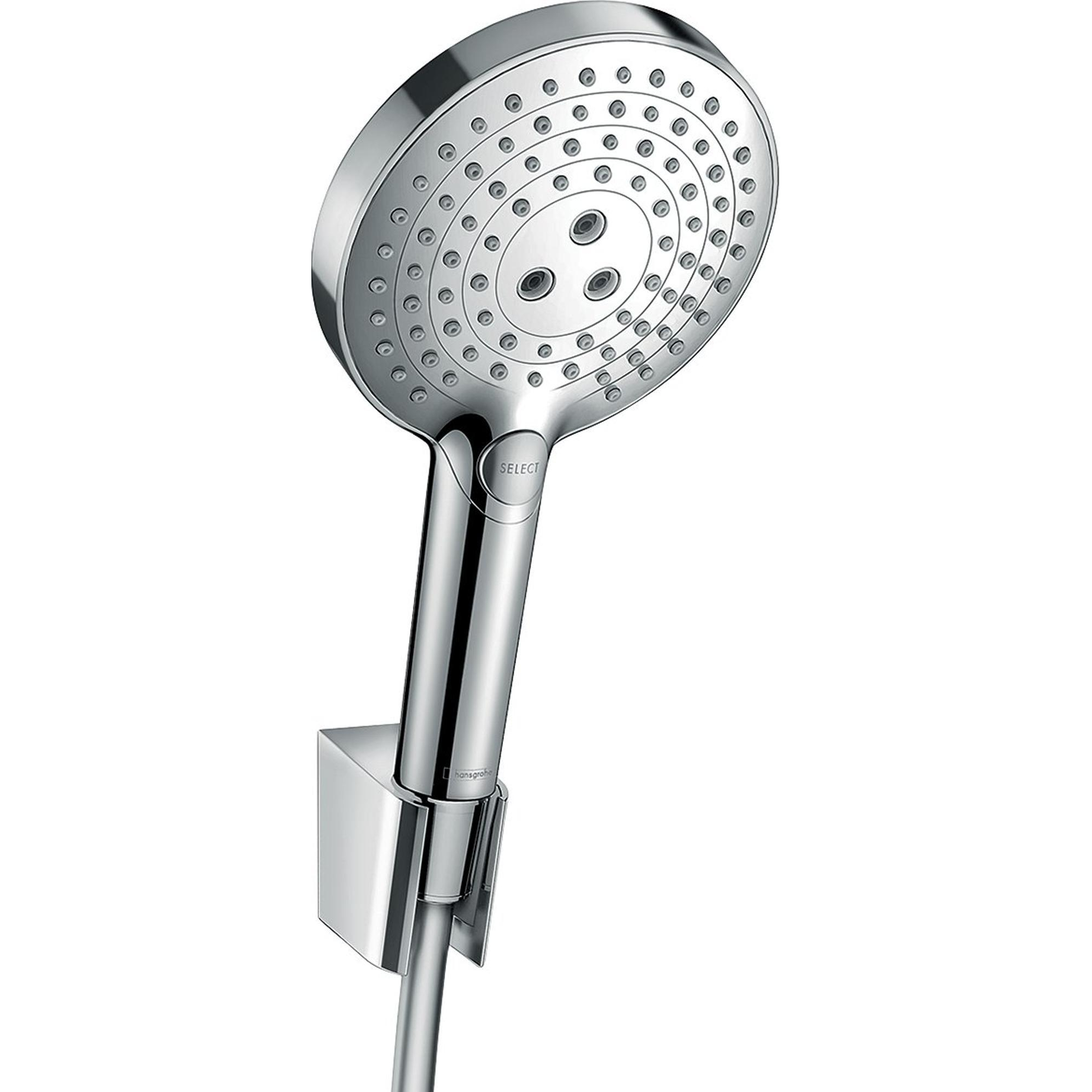 De douchehouderset Raindance Select S 120 3jet 1,60 m van hansgrohe bestaat verder uit douchekop, douchehouder en doucheslang. Hier is alles beschikbaar voor groot doucheplezier: De handdouche in chroomglans verwent met drie verschillende straalsoorten: Met RainAir wordt het water met lucht verrijkt. Daardoor ontstaan prachtige zachte en volle druppels voor een ontspannende regendouche. In tegenstelling daarmee stimuleert de krachtige straalsoort Rain en is ideaal om ‘s ochtends goed wakker te worden of shampoo uit te spoelen. De massagestraal Whirl helpt met zijn drie roterende waterstralen gericht bij het ontspannen van gespannen spieren.