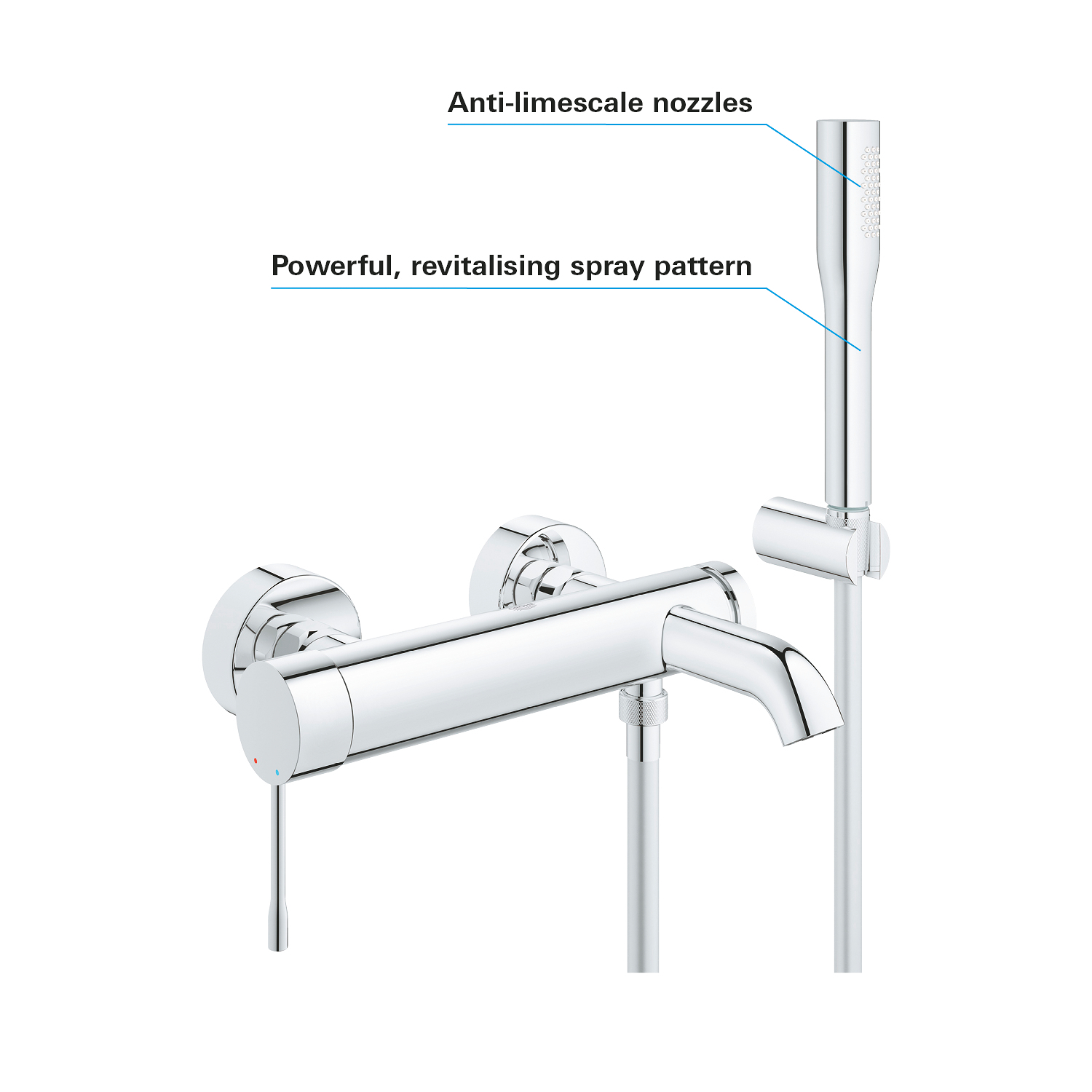 GROHE Essence New badkraan met douchegarnituur – mooi om te zien, praktisch in het gebruik Modern, minimalistisch, maar warm en tastbaar: de GROHE Essence kranen leveren uitzonderlijke prestaties en geven je de mogelijkheid om je badkamer op jouw smaak af te stemmen. De GROHE Essence serie bestaat uit een uitgebreid aanbod aan maten en functies en biedt jou alle flexibiliteit om een harmonische badkamer te creëren, terwijl de geavanceerde technologie aan de binnenkant betrouwbare en onovertroffen prestaties leveren..