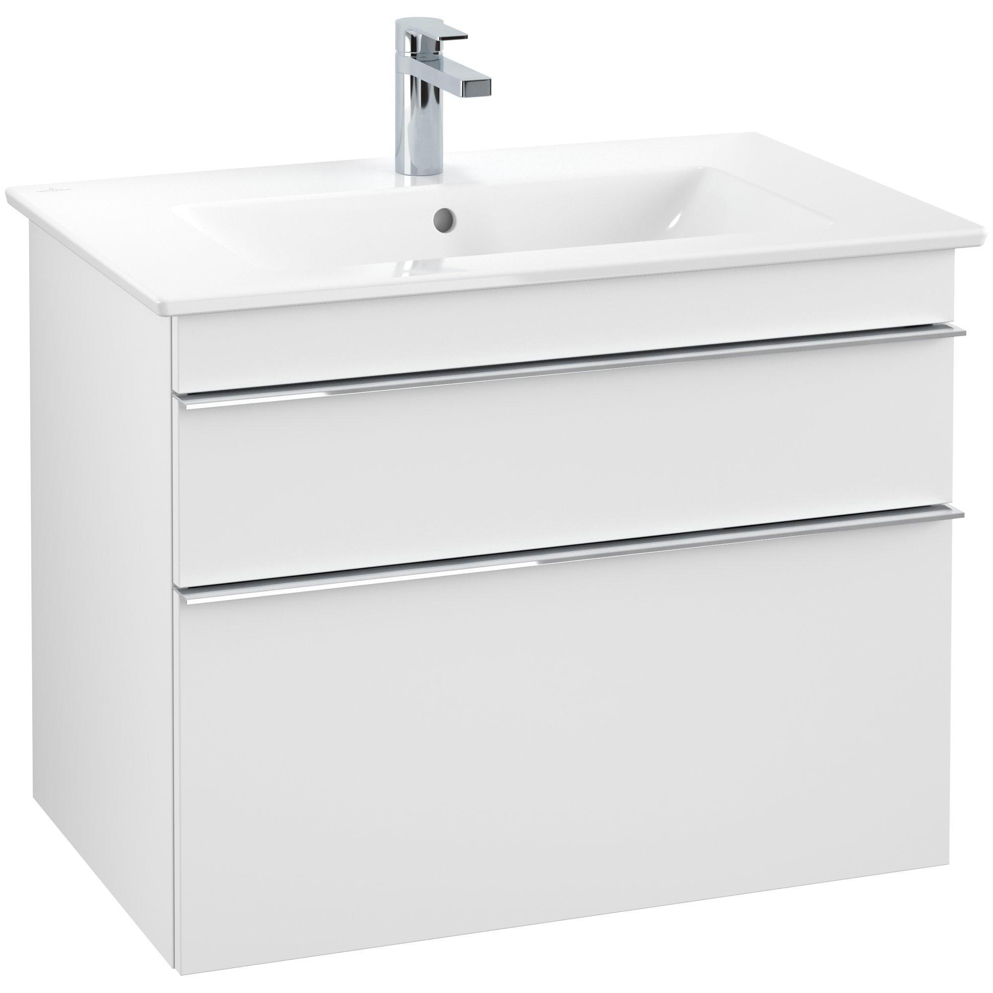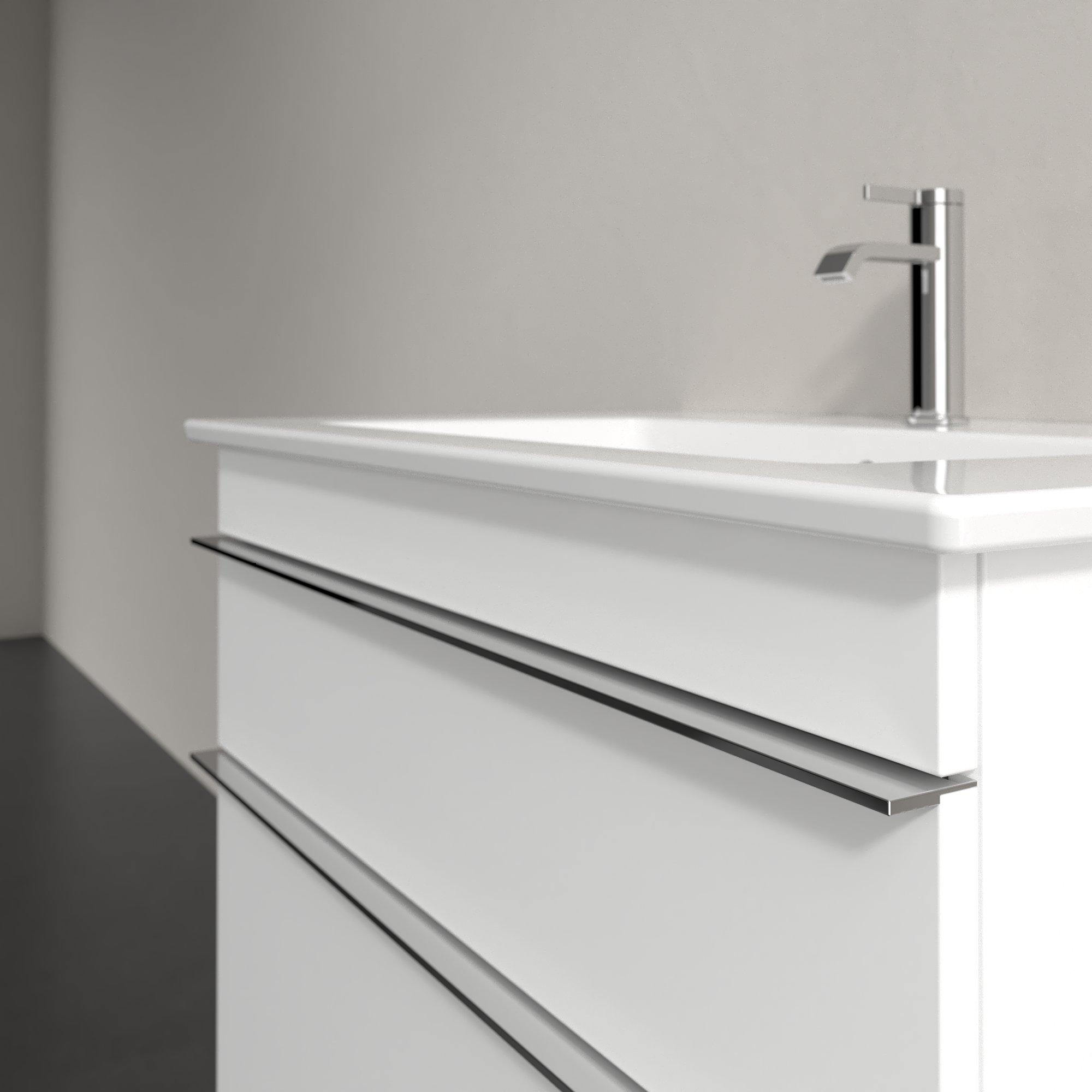 De wandhangende Venticello wastafelonderkast van Villeroy & Boch is doordacht en beschikt over slimme details. Optisch maakt hij indruk met dunne randen en een filigraan, modern design. Dit wordt subtiel onderbroken door een elegante greep op het onderhoudsvriendelijke en duurzame front. Ook functioneel heeft het meubel heel wat te bieden: Twee volledig uittrekbare lades bieden in combinatie met variabel verstelbare glazen scheidingswandjes en een chique accessoirebox een individuele, heldere interieurindeling voor kleine en grote badkamerbenodigdheden. De antislipbodem zorgt voor een goede grip. Dankzij het zelfsluitsysteem en SoftClosing-functie sluiten de lades veilig en geruisloos. Gewoon praktisch!
