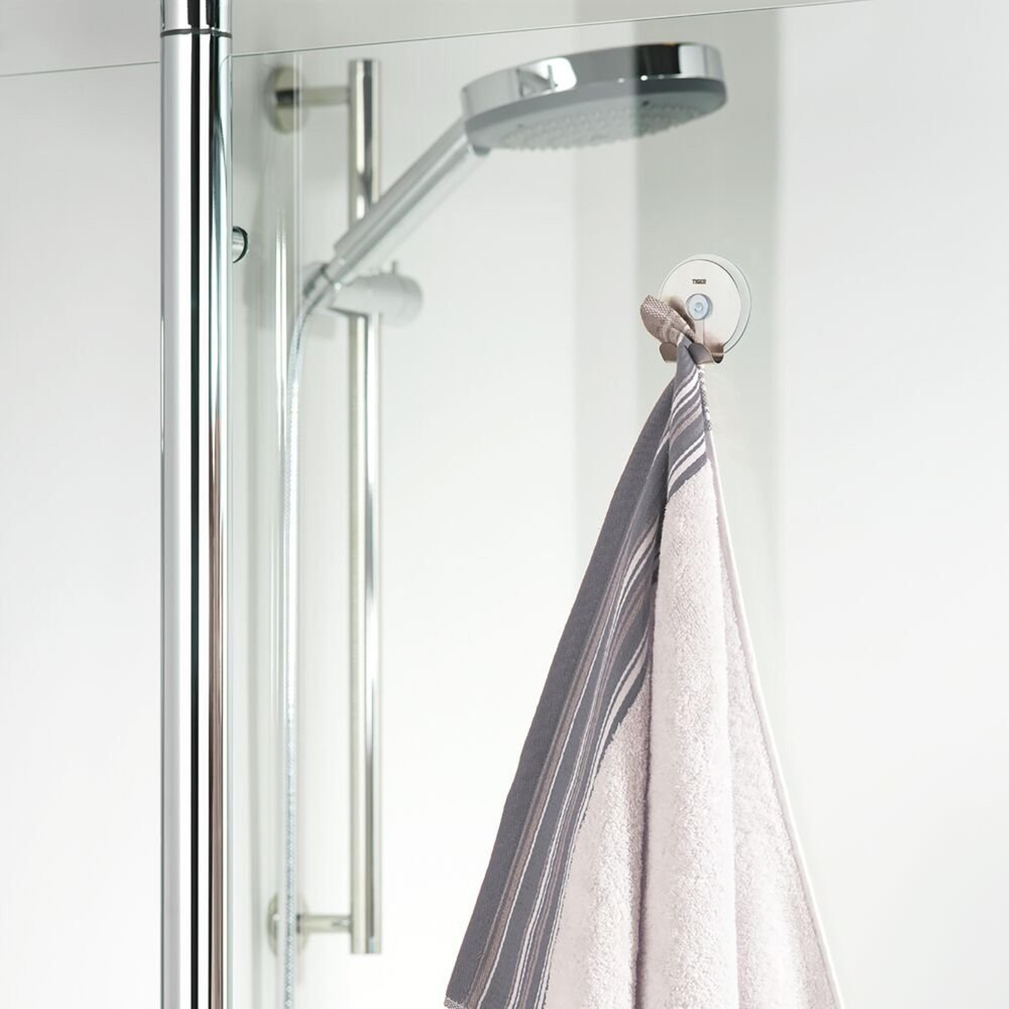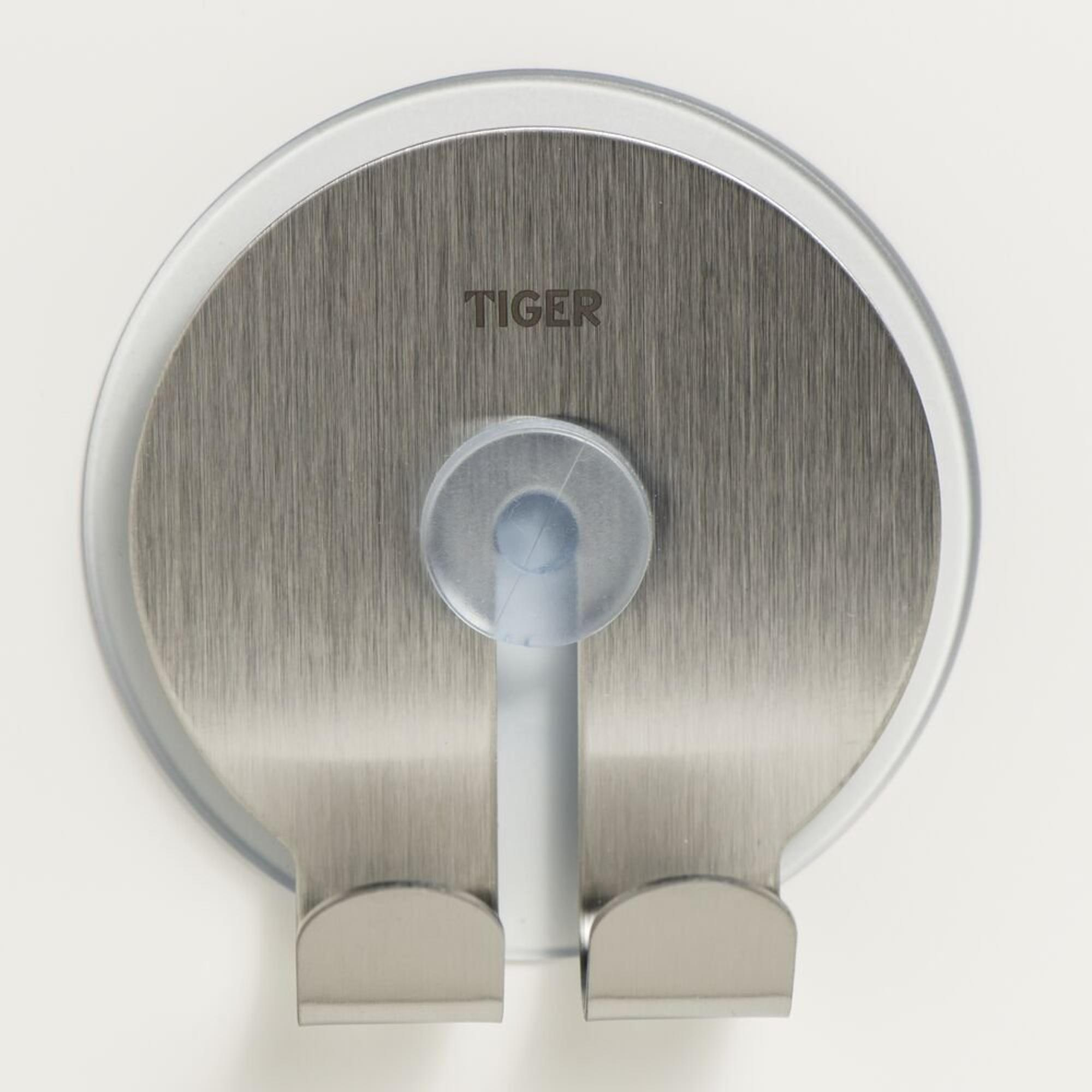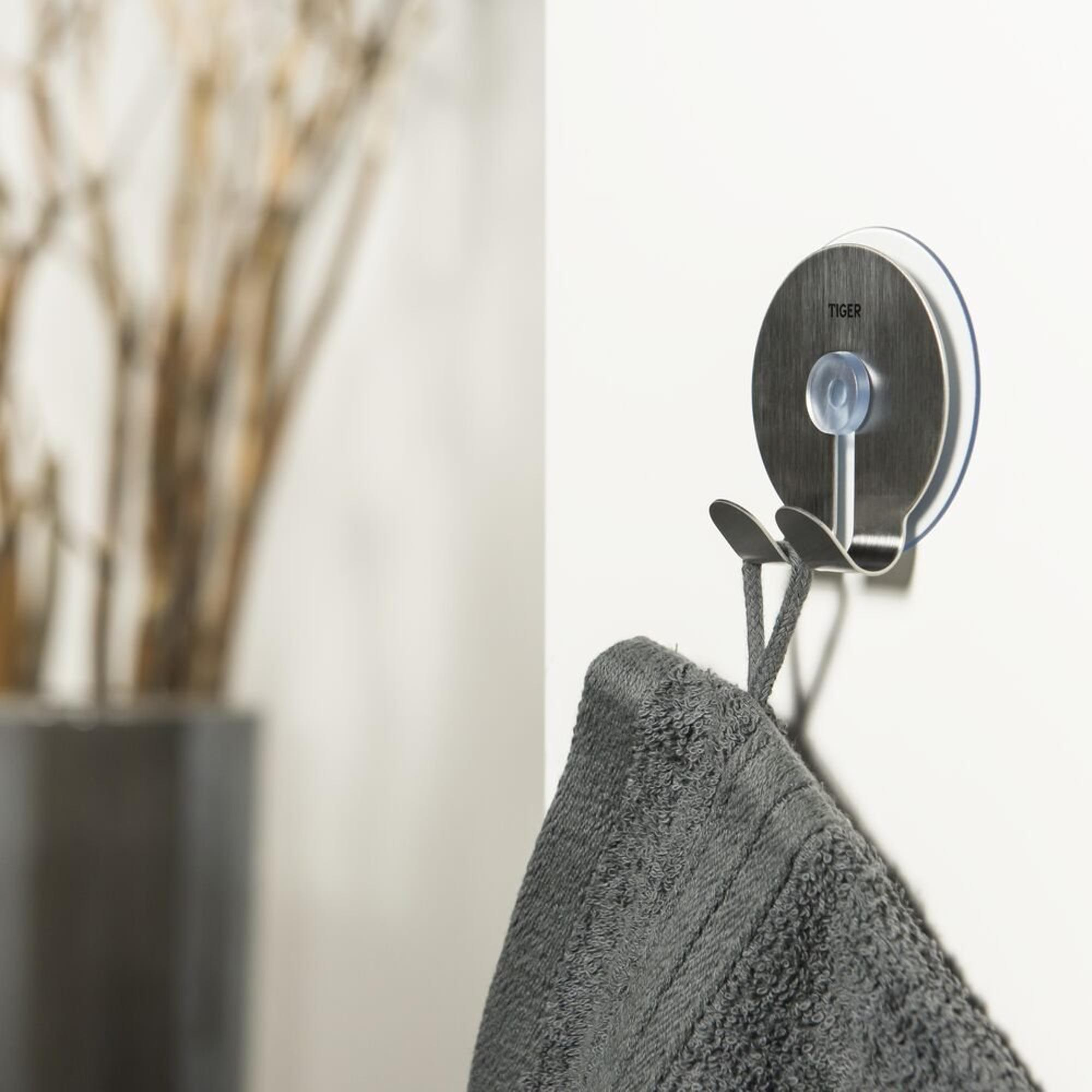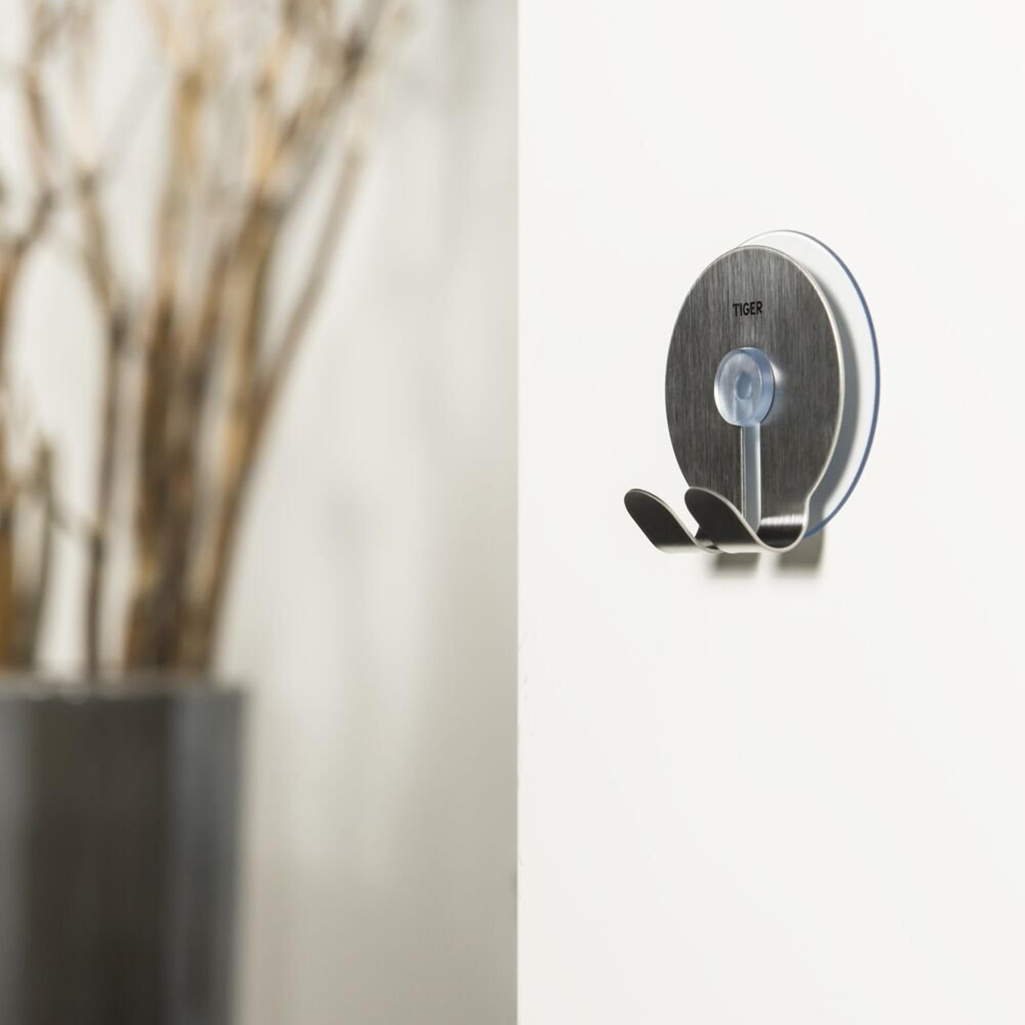 De Tiger Twin haak in de kleur transparant / RVS geborsteld. De dubbele zuignap-haak is eenvoudig aan te brengen op harde, gladde ondergronden in bijvoorbeeld de badkamer of de keuken.