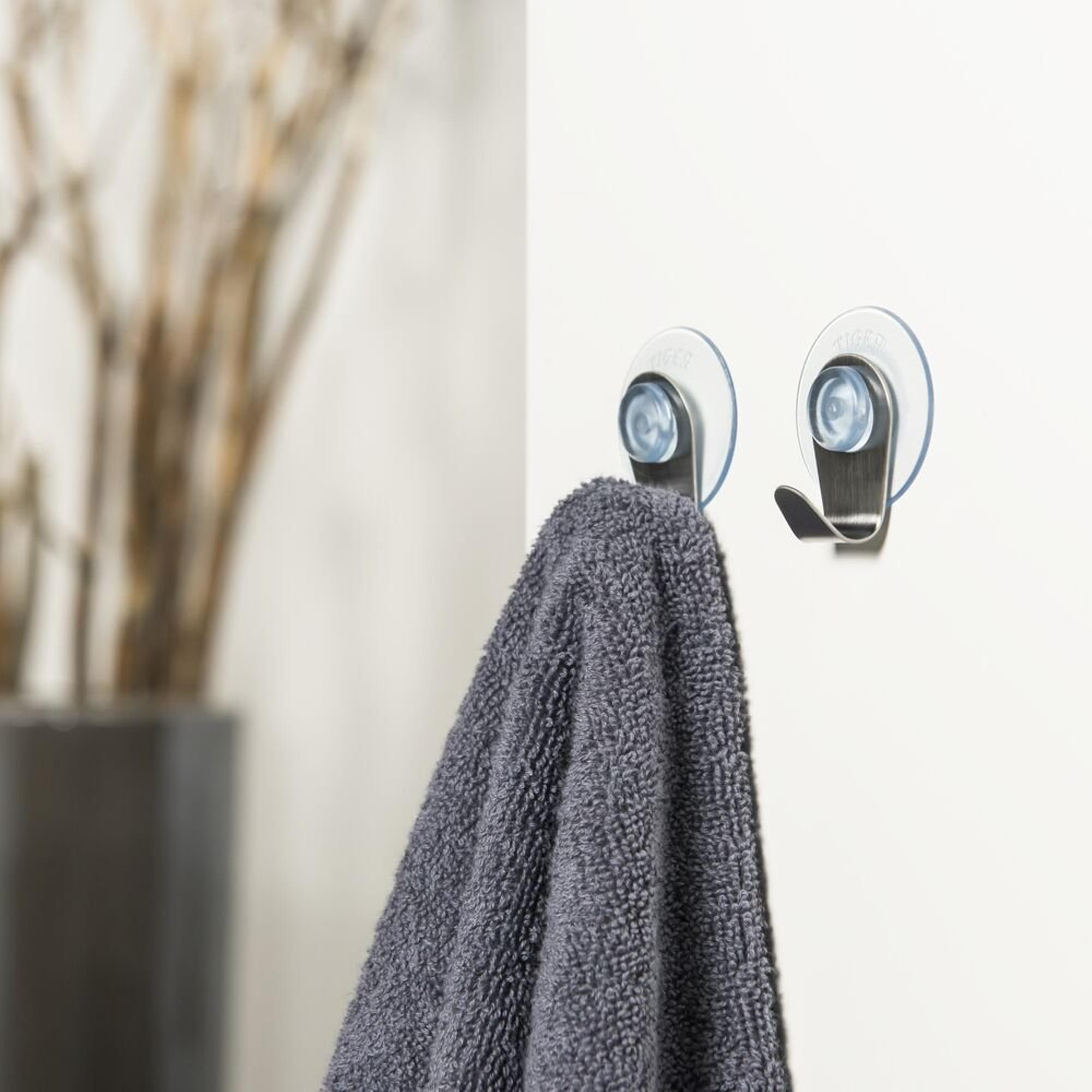 De Tiger Simply haak (set van 2 stuks) in de kleur transparant / RVS geborsteld. De zuignap-haak is eenvoudig aan te brengen op harde, gladde ondergronden in bijvoorbeeld de badkamer of de keuken.