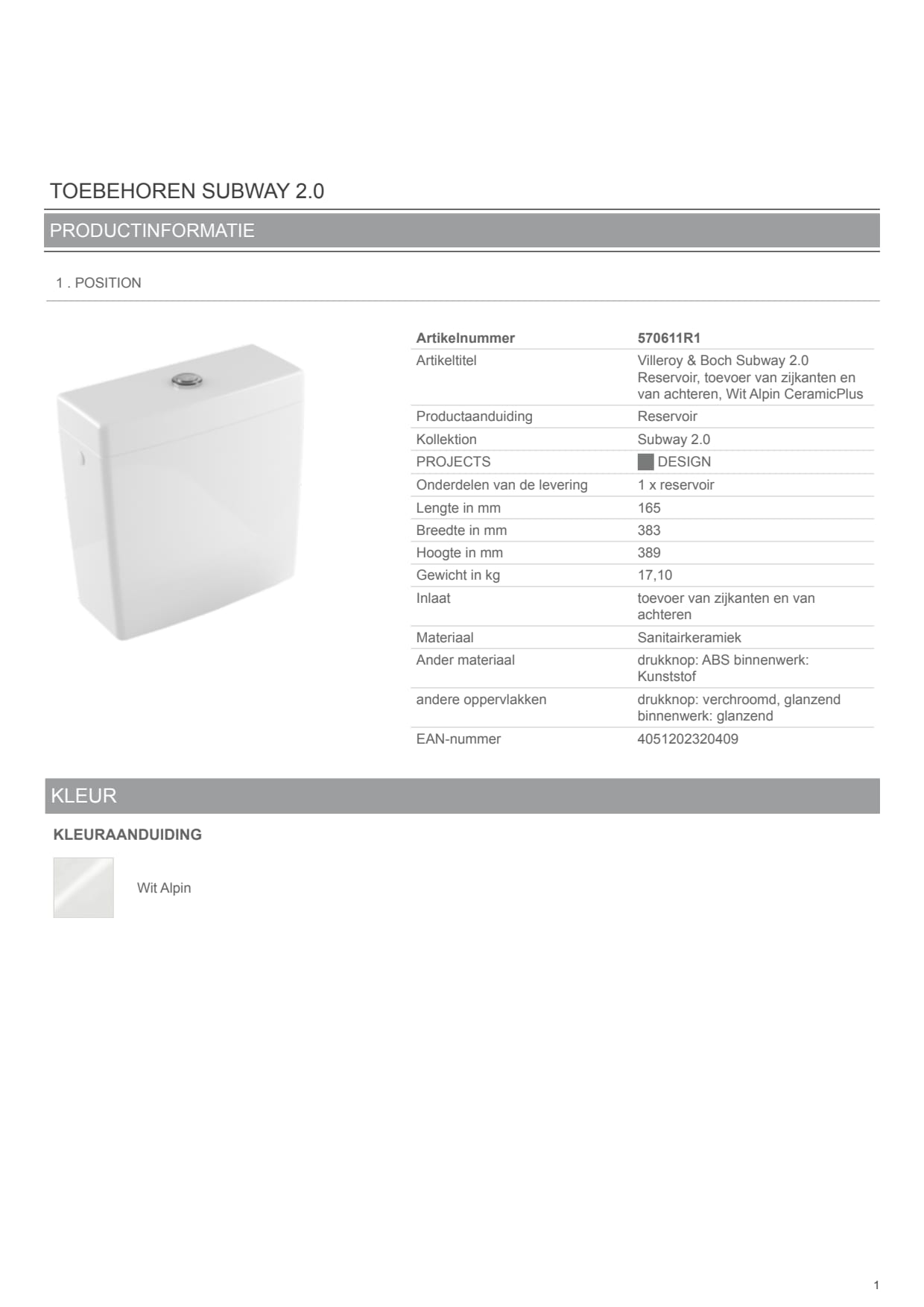 Villeroy & Boch Subway 2.0 Reservoir - toevoer van zijkanten en van achteren - Wit Alpin CeramicPlus