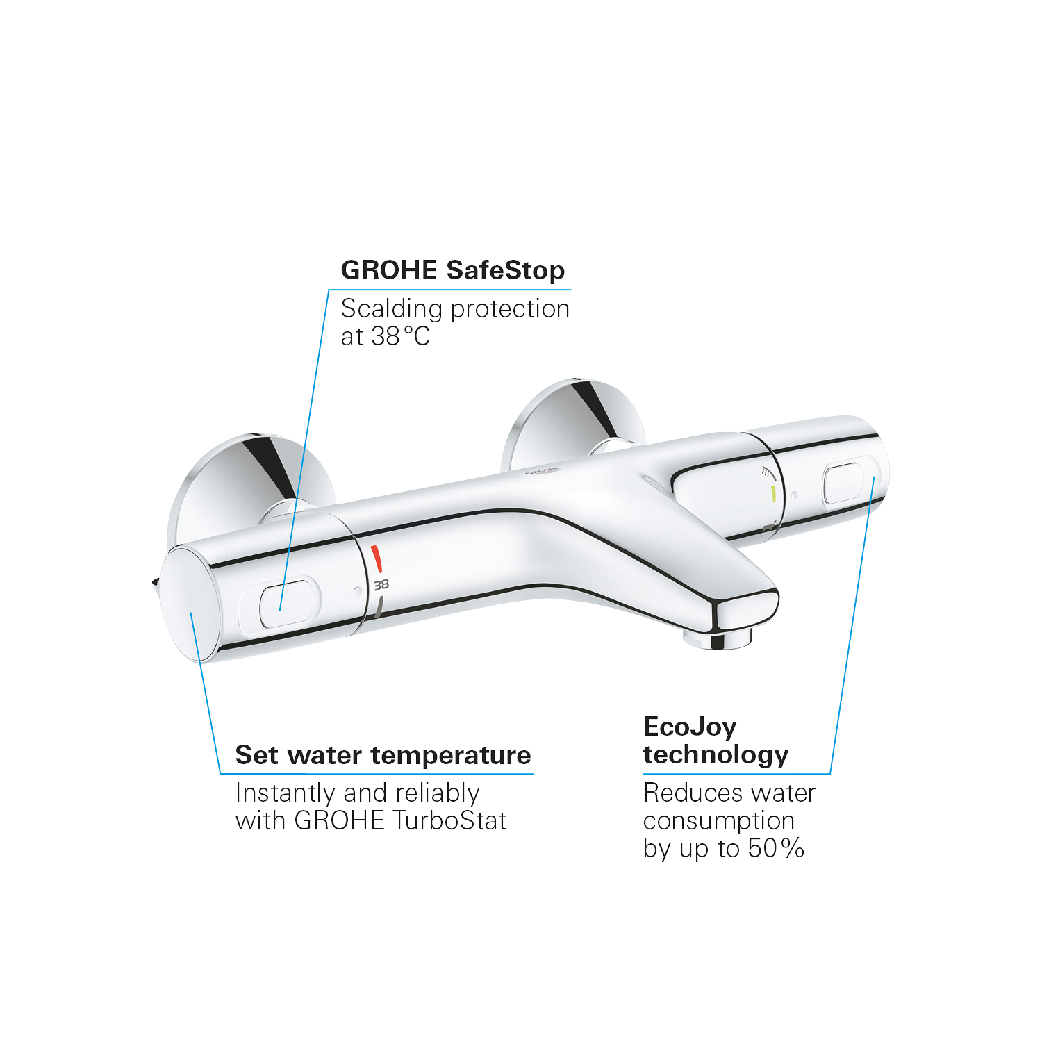 GROHE Precision Trend New – de badthermostaat voor optimaal badplezier SafeStop op 38°C Waterbesparing to 50% met GROHE EcoJoy™ knop Ergonomische grepen voor een goeie grip, zelfs met natte handen Beschikbaar voor bad en douche en met doucheset Duurzame GROHE StarLight® chroomlaag GROHE Precision Trend thermostaatkranen zijn speciaal aanbevolen voor hedendaagse badkamers.