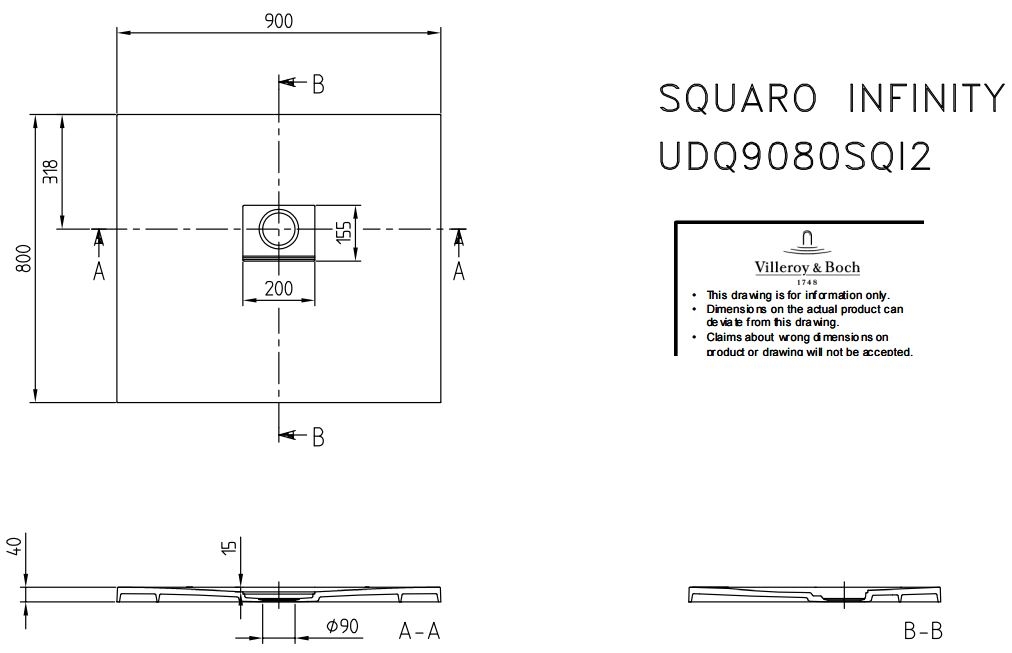 Villeroy & Boch Squaro infinity douchebak 90x80x4cm antraciet