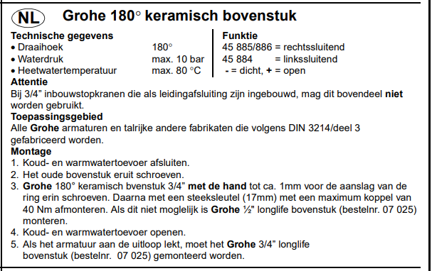 GROHE Keramisch bovendeel 3/4 met keramische schijven Draaihoek 180° Rechtsdraaiend