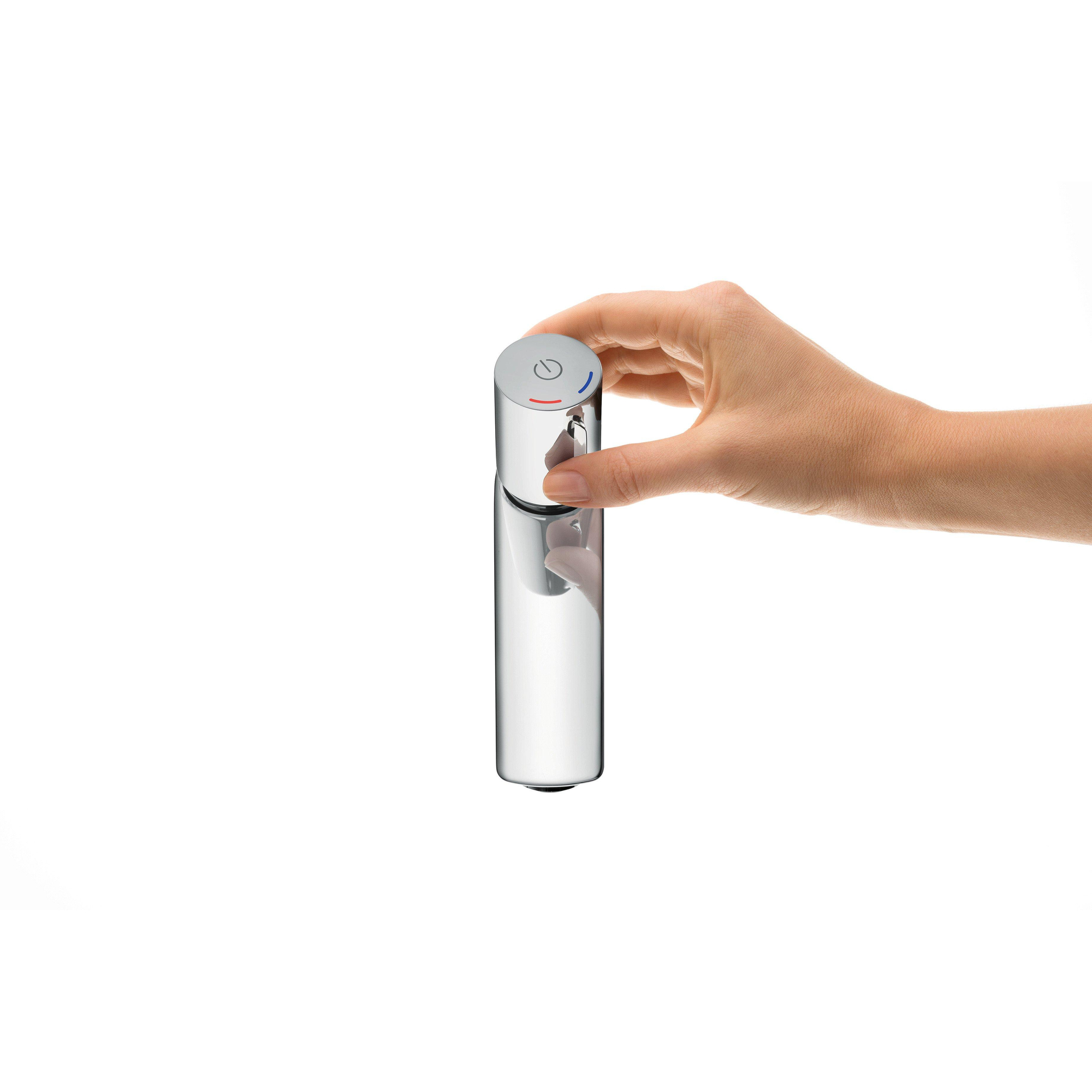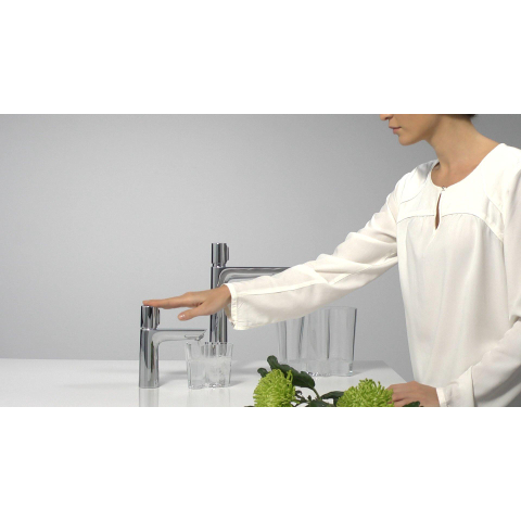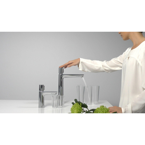 De Talis Select E wastafelmengkraan maakt indruk met modern design en tijdloze elegantie. De mengkraan glanst heldere, met precieze hoeken en mooie, zwevende oppervlakken. Dankzij Select-technologie is er geen handgreep, waardoor de mengkraan er in iedere instelling harmonisch uitziet. De greep hoeft niet te worden teruggedraaid. In plaats daarvan is de vooraf ingestelde watertemperatuur direct beschikbaar