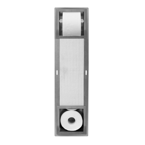 De Looox Closed inbouw closetrolhouder met reserverolhouder en ruimte voor 5 rollen in geborsteld roestvrij staal is een prachtige toevoeging aan elke badkamer. Deze stijlvolle en functionele accessoire combineert elegantie met gebruiksgemak, waardoor het een must-have is voor moderne badkamers.