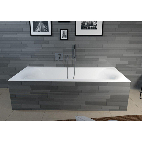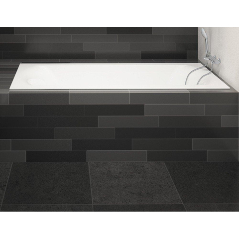 Inbouwbad, met lage badrand, hoogglans wit acryl, rechthoekig met afgeronde binnenvorm, afvoer aan de zijkant.