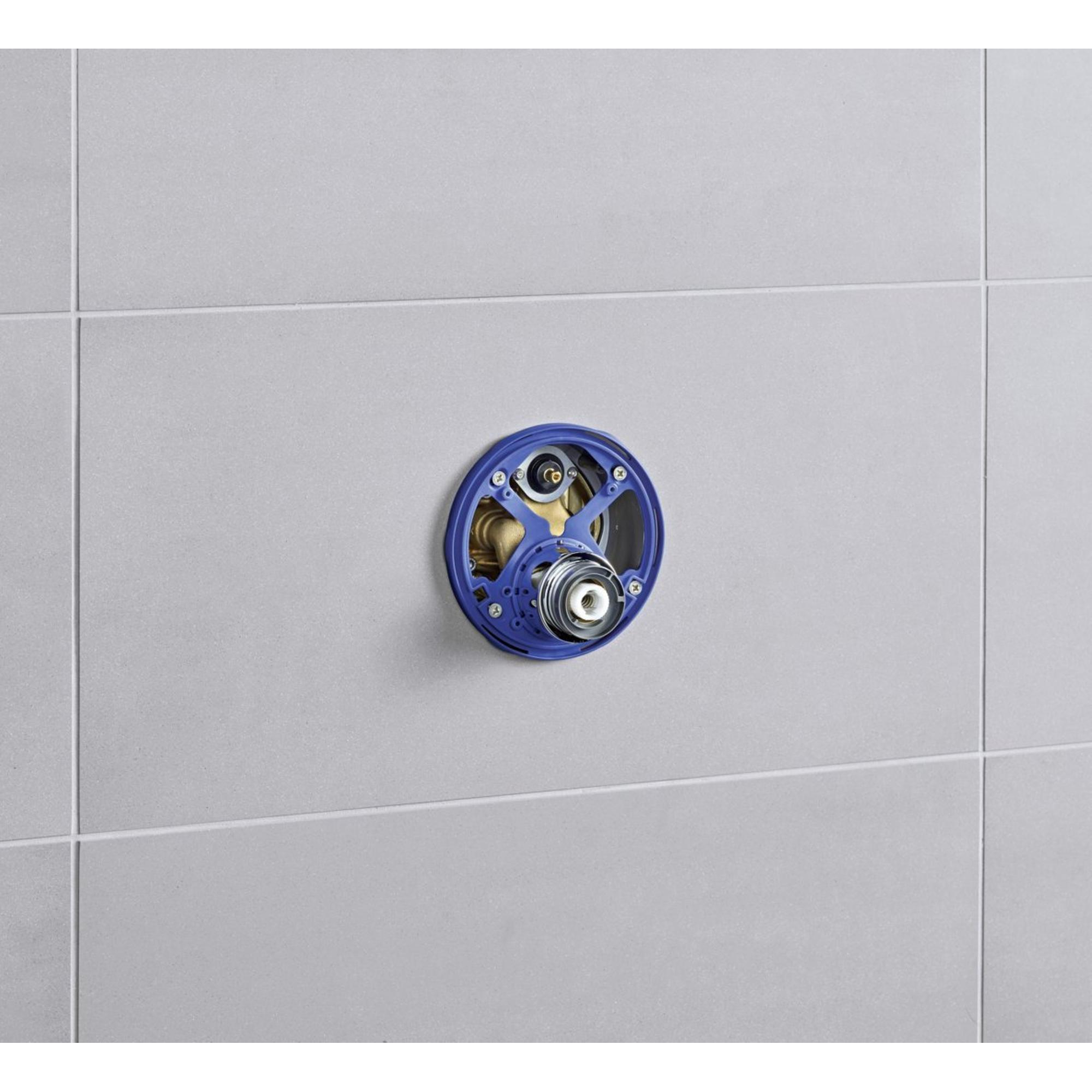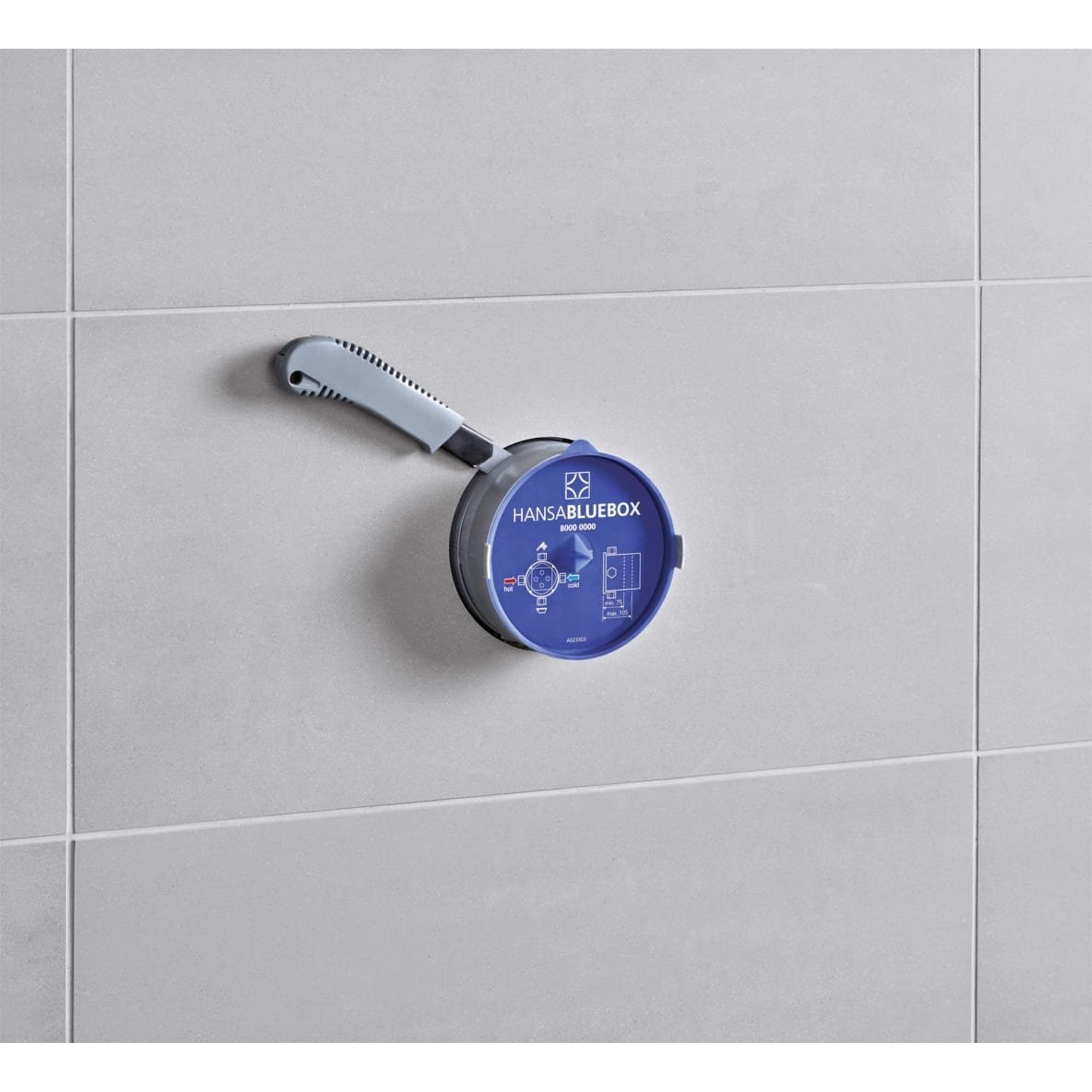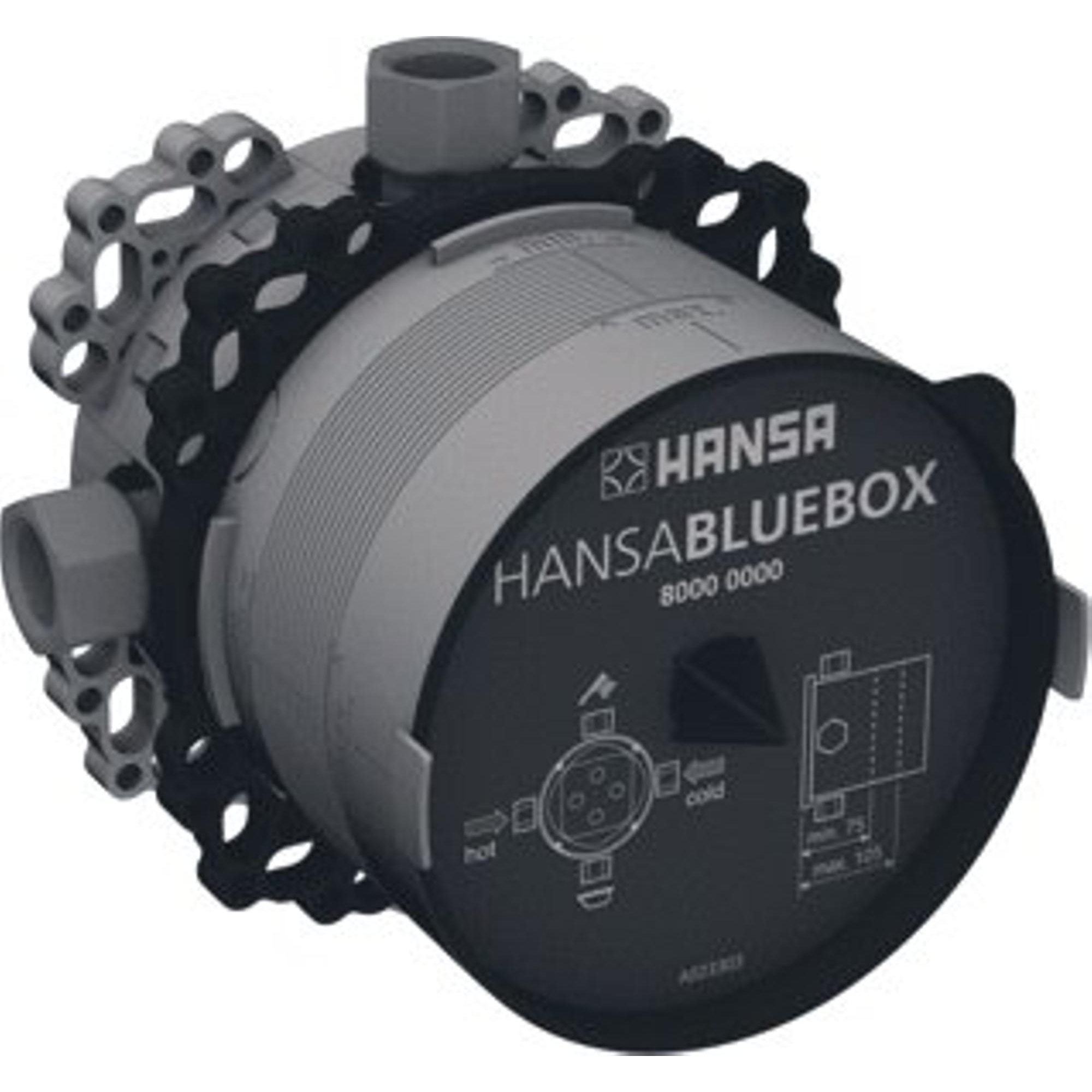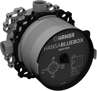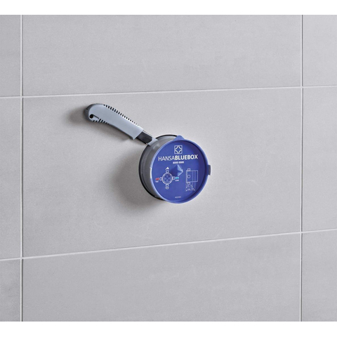 Alle Hansa BLUEBOX-inbouwdelen zijn uitgerust met een BLUESWITCH keramische schakelaar, drukonafhankelijk en eenvoudig te bedienen. Met BLUETUNE kunt u de positie van de afdekrozet met maximaal 3,5 ° in elke richting aanpassen. Met behulp van het nieuwe BLUECLICK-systeem wordt de schroefloze rozet veilig door middel van zes vormsluitende bevestigingspunten op de rozethouder vastgezet.