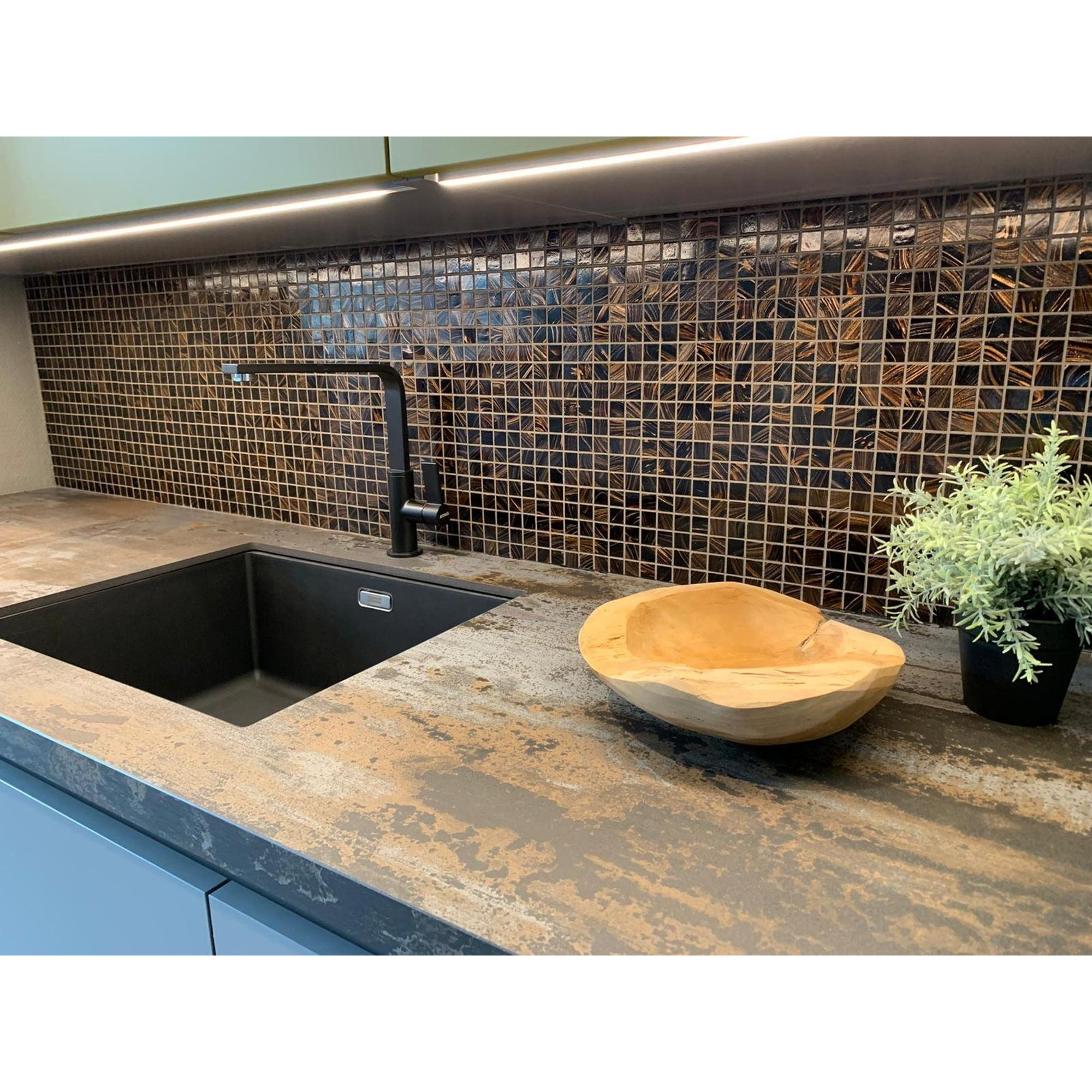 De Mosaic Factory Amsterdam mozaïektegel straalt een onmiskenbare pracht uit. Het glanzende oppervlak van de tegel vangt het licht op en creëert een schitterend spel van reflecties in de ruimte. De rijke bruine tint voegt warmte en diepte toe aan elke omgeving, waardoor een luxe uitstraling ontstaat die de aandacht trekt en bewondert.