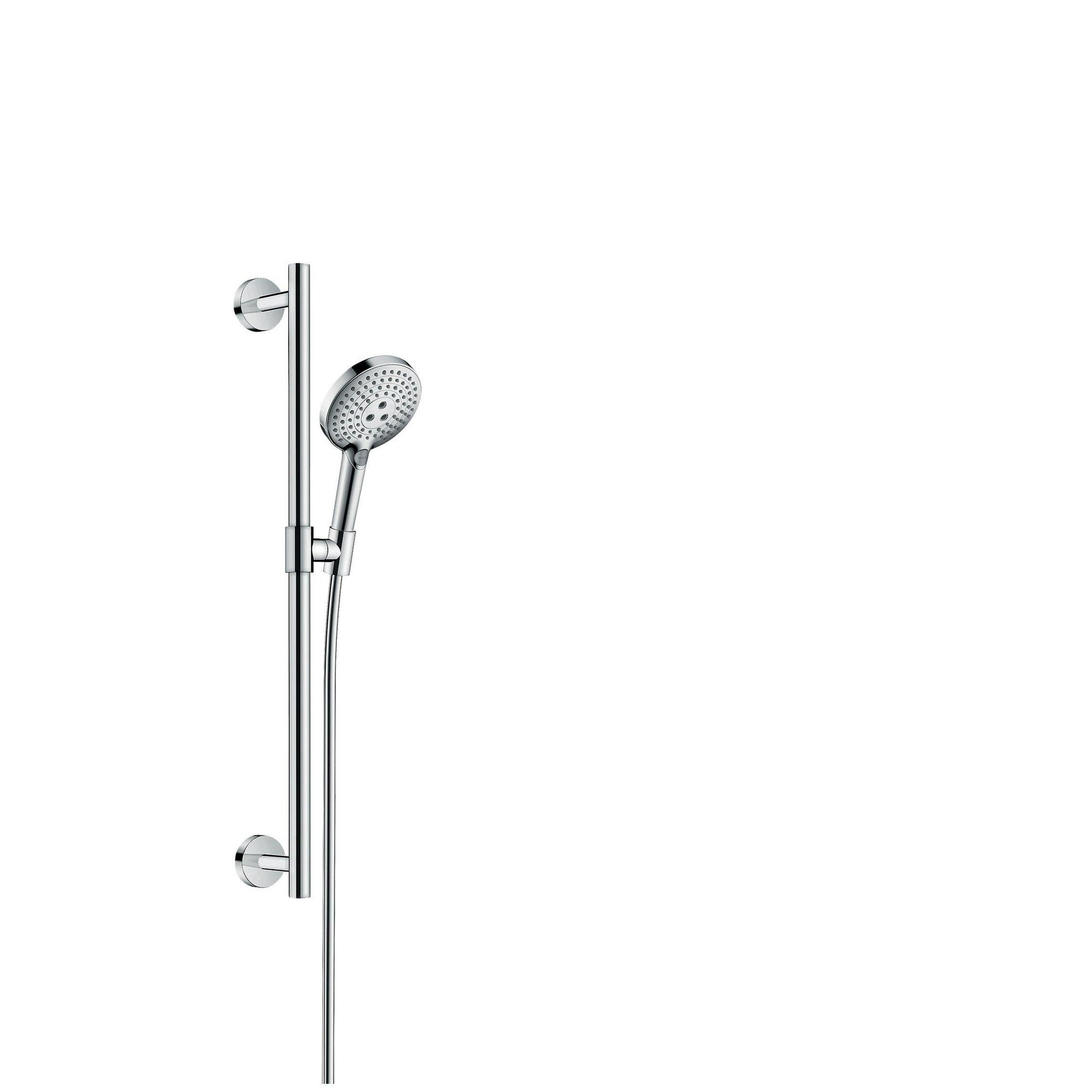 De Raindance Select S doucheset bestaat uit een hansgrohe regendouche, een 0,65 m lange glijstang en een 1,60 m lange doucheslang. De TÜV-geteste glijstang zorgt voor veiligheid en kan bovendien als badgreep worden gebruikt. Hij kan een trekkracht van tot 200 kg weerstaan. De 25 mm dikke, verchroomde messingstang en solide metalen wandsteunen zorgen voor een betrouwbare greep. De douchekop kan aan de stang flexibel in hoogte worden ingesteld.