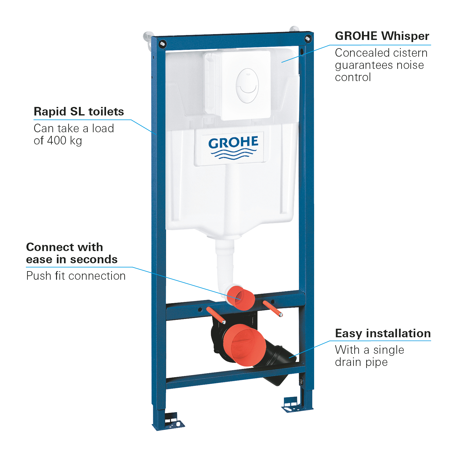 GROHE Rapid SL installatiesysteem voor waterbesparende en geluidsloze toiletspoeling Het Rapid SL systeem geeft je de vrijheid om de ideale badkamer te creëren. Het zorgt voor een veilige en snelle manier om zwevende toiletten, wastafels, wandbidets en urinoirs te installeren. De frames zijn verkrijgbaar in drie verschillende hoogtes. De frames zijn voorgemonteerd, beschikken over bevestigingspunten voor wandclosets en worden streng getest. De frames voor de wandclosets kunnen maximaal 400 kg dragen.