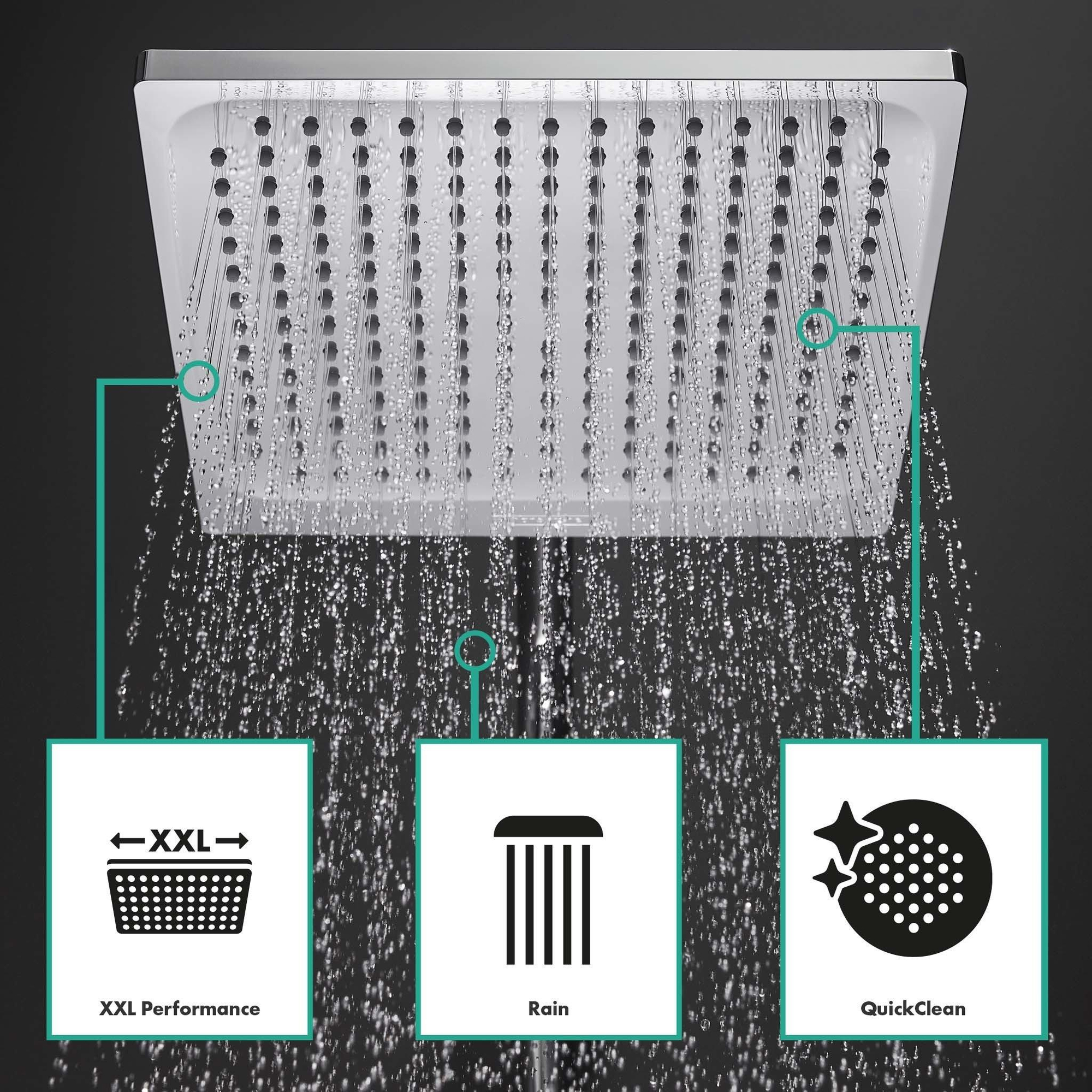 De Showerpipe Crometta E 240 1jet met ééngreeps mengkraan is een compleet systeem, dat kan comfortabel kan worden bediend en zorgt voor veelzijdig douchegenot. De vierkante, 240 mm x 240 mm grote hoofddouche en de 100 mm grote handdouche verdelen het water in grote vlakken over het lichaam (XXL performance). Daarbij zorgen twee straalsoorten voor bijzonder doucheplezier: De krachtige regenstraal Rain van de hoofddouche met een verbruik van max. 15 l/min (bij 3 bar) is een weldadige frisse kick voor het hele lichaam. Ook de handdouche heeft deze activerende regenstraal, die met 14 l/min (bij 3 bar) een even verkwikkende uitwerking heeft. De vitaliserende IntenseRain-straal van de handdouche (max. verbruik 11,5 l/min bij 3 bar) is geweldig om haren uit te spoelen.