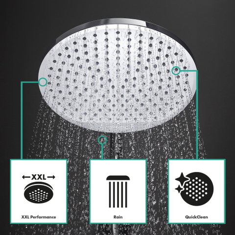 De Showerpipee Crometta S 240 1jet met badthermostaat is dankzij zijn comfortabele bediening, verschillende straalsoorten en eenvoudige installatie een compleet systeem voor veel doucheplezier in bad. De thermostaat zorgt dat het water stabiel de ingestelde temperatuur houdt en vergroot zo het comfort. Bij veranderingen in de waterdruk reageert deze razendsnel en beschermt betrouwbaar tegen te heet of te koud water. De 240 mm grote hoofddouche en de 100 mm grote handdouche verdelen het water over het lichaam (XXL performance). Daarbij zorgen twee straalsoorten voor bijzonder doucheplezier: De krachtige regenstraal Rain van de hoofddouche met een doorstroomhoeveelheid van max. 16 l/min (bij 3 bar) is een vitaliserende frisse kick voor het hele lichaam. Ook de handdouche heeft deze activerende regenstraal, die met 14 l/min (bij 3 bar) een even verkwikkende uitwerking heeft. De vitaliserende IntenseRain-straal van de handdouche (max. verbruik 11,5 l/min bij 3 bar) is geweldig om haren uit te spoelen. Dankzij de baduitloop met een doorstroomhoeveelheid van maximaal 20 l/min (bij 3 bar) is het bad snel gevuld. Comfortabel omstellen: Met de ergonomische vleugelgreep op de thermostaat kan comfortabel worden gewisseld tussen hoofd- en handdouche. Door te draaien aan de straalplaat kunt u wisselen van straalsoort op de douchekop.