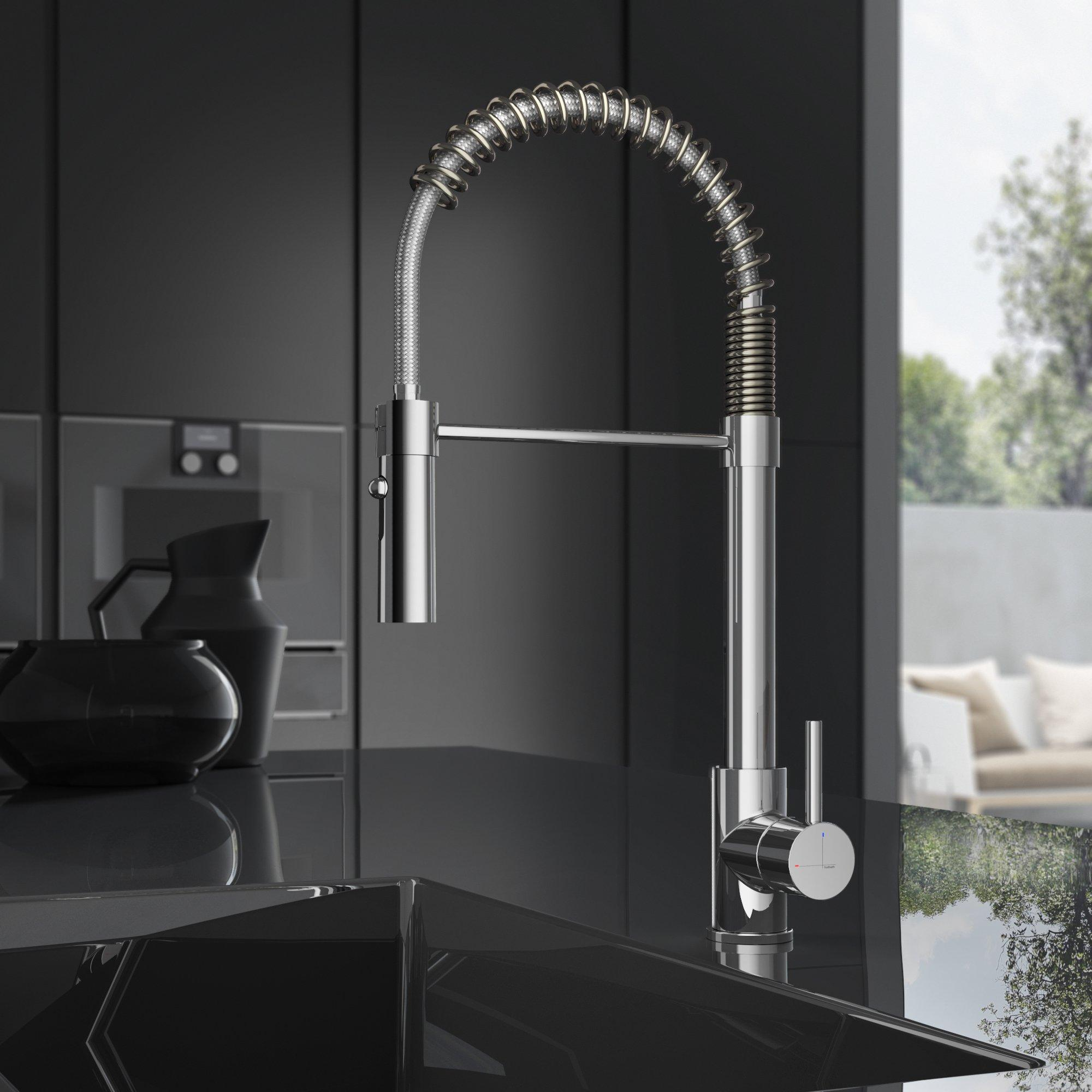 De uittrekbare handdouche zorgt voor extra spoelgemak. De Hotbath keukenmengkraan beschikt over een draaibare uitloop.