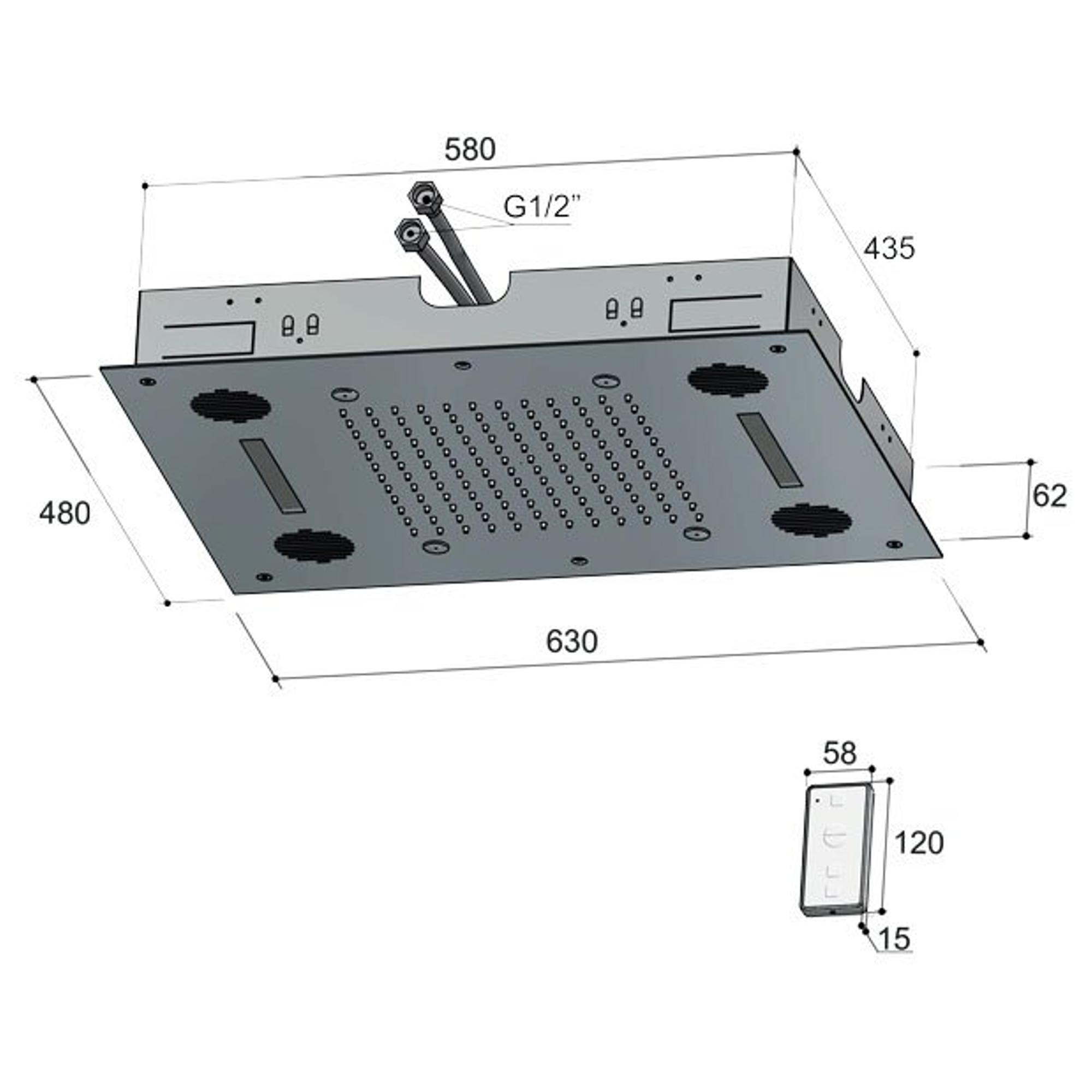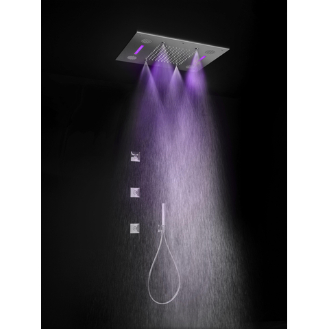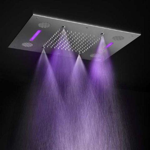 De hoofddouche is rechthoekig 48 bij 63 cm, heeft LED-verlichting met een bijbehorende afstandbediening. Voorzien van twee verschillende stortdouches, nevel. Inbouw inclusief frame.