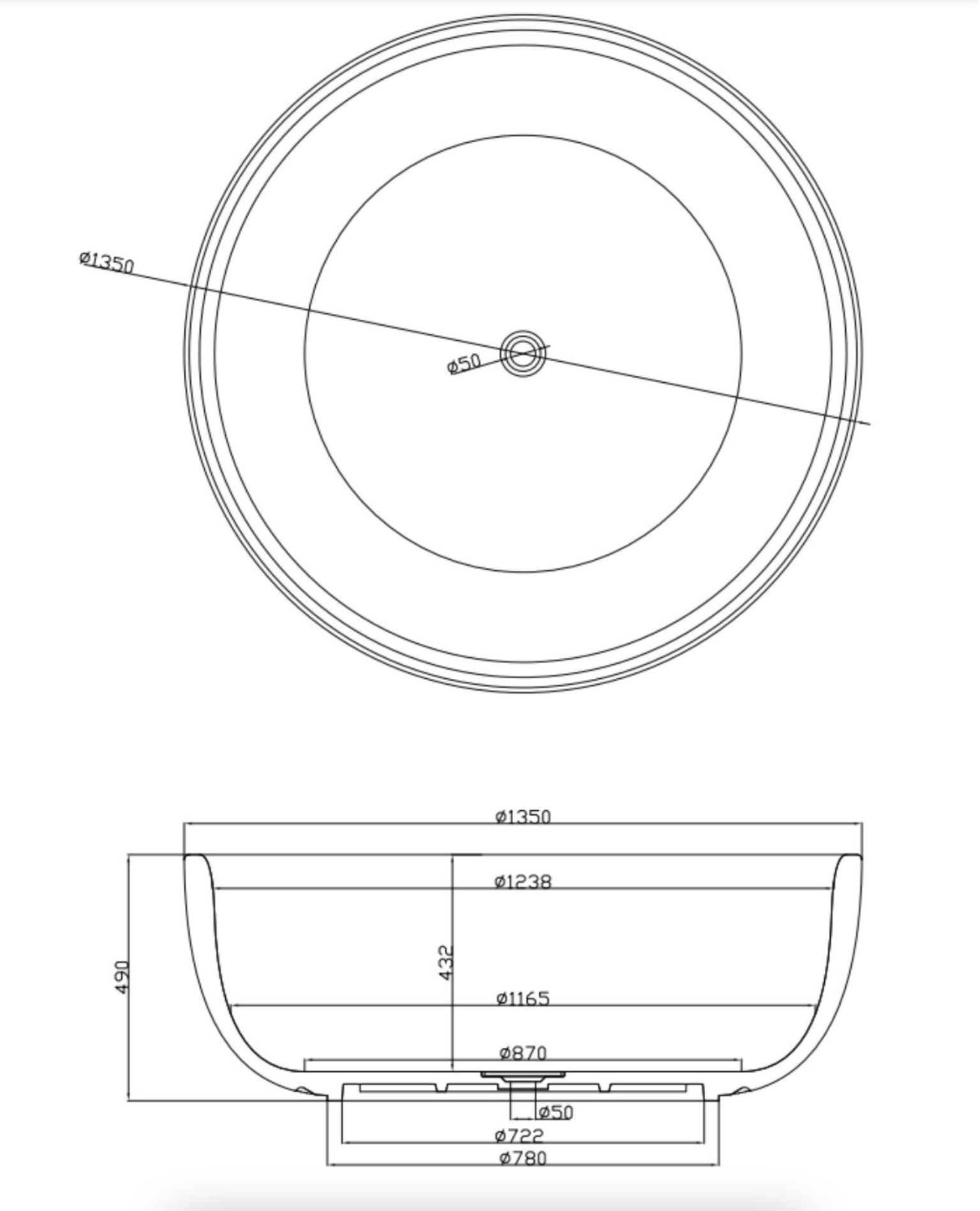 De diameter van het ligbad is 135 cm, de hoogte van het ligbad is 49 cm. Het bad heeft een inhoud van 400 liter water. Het bad wordt geleverd met een afvoerplug met een mat witte afwerking en een afvoer.