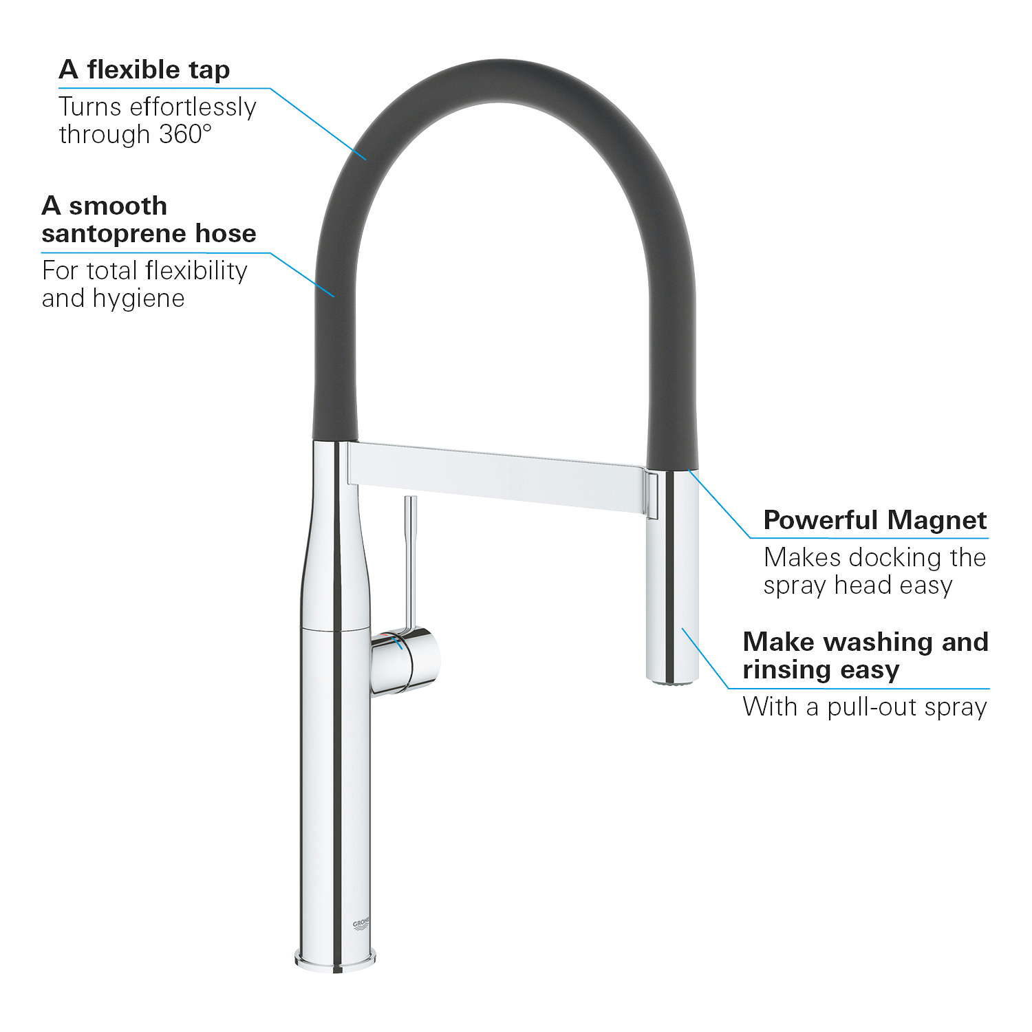 De GROHE Essence Professional – functionele perfectie met een strak design Ontdek een minimalistische stijl vol warmte met GROHE's nieuwe Essence kraan. De slanke architectonische vorm wordt versterkt door organische designelementen, ideaal voor een eigentijdse keuken. Een onderscheidende, delicate vorm verbergt de geavanceerde technologie in de nieuwe Essence kraan. De cilindrische kraan is superslank, dankzij een nieuwe, kleine cartouche. Een stevige metalen sproeikop garandeert levenslange prestaties, en je kunt gemakkelijk schakelen tussen twee straalsoorten met een toggle functie die flexibiliteit op de voorgrond zet.