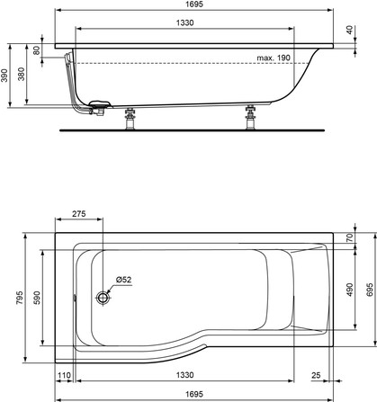 Ideal Standard Connect Air inbouwbad met douchezone links 170x80cm acryl wit zonder potenset
