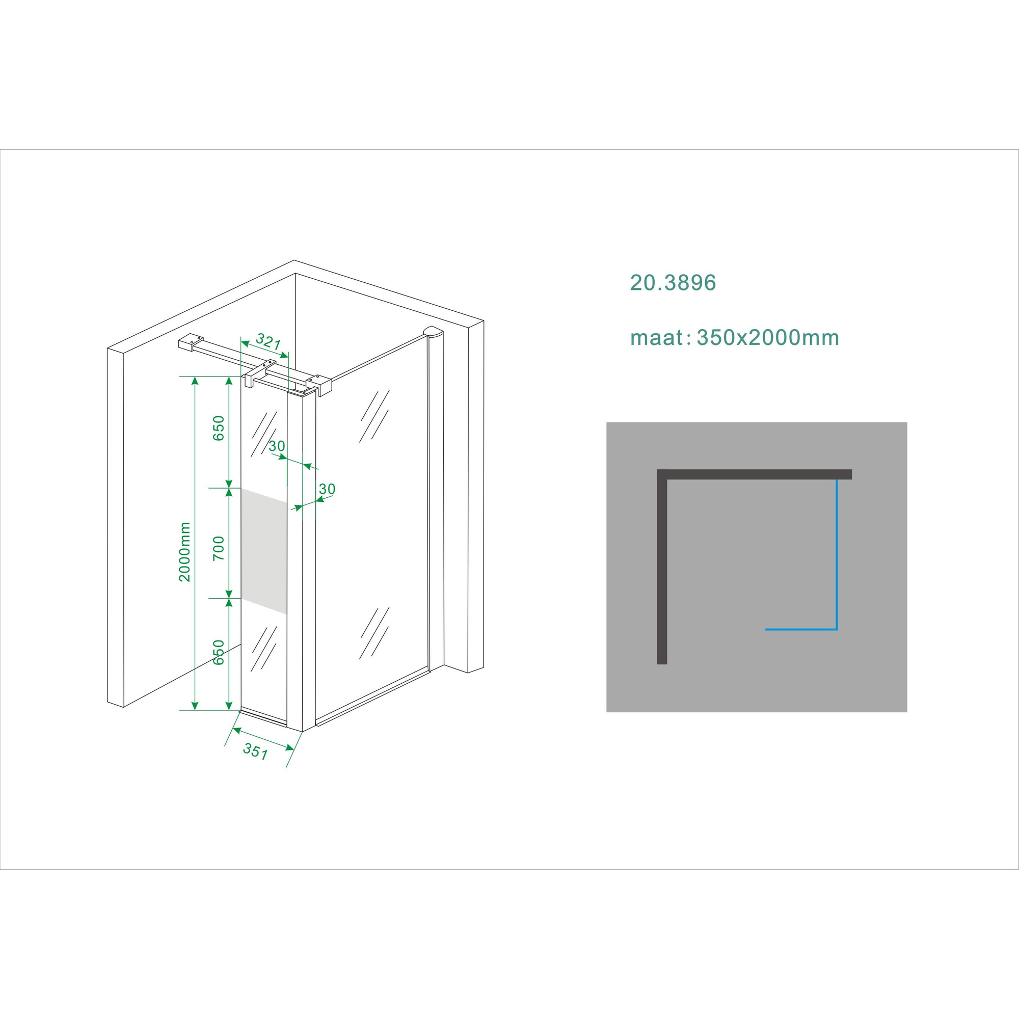 Wiesbaden Zijpaneel 35 x 200 cm met hoekprofiel voor inloopdouche chroom met 10 mm NANO ged.matglas