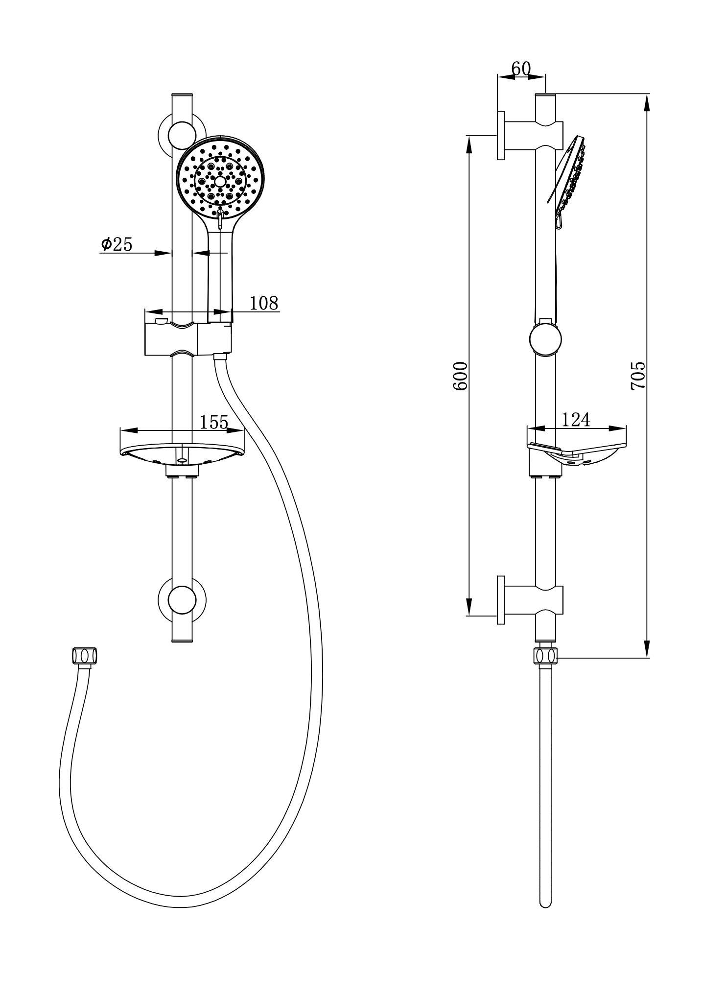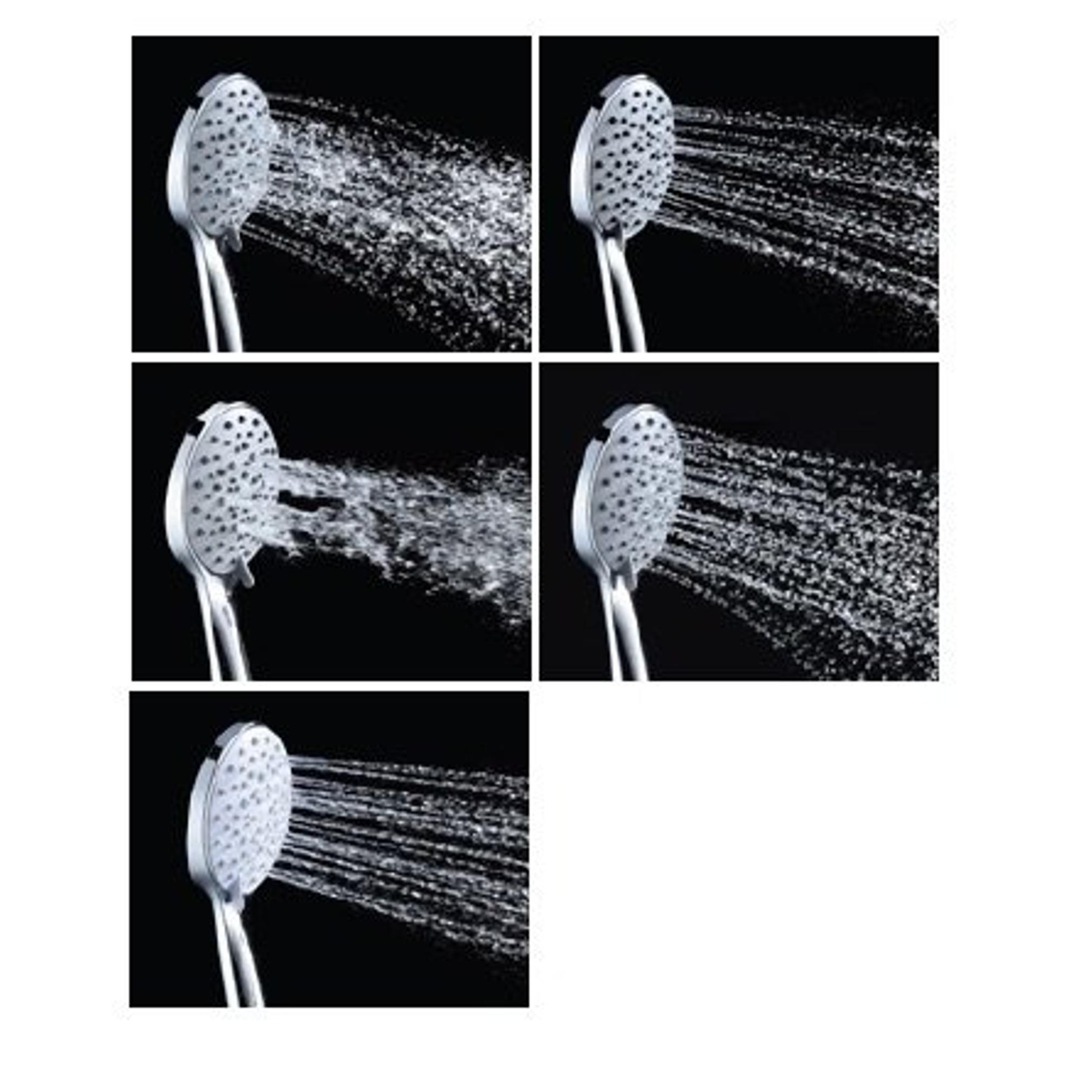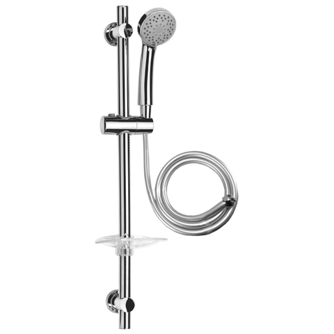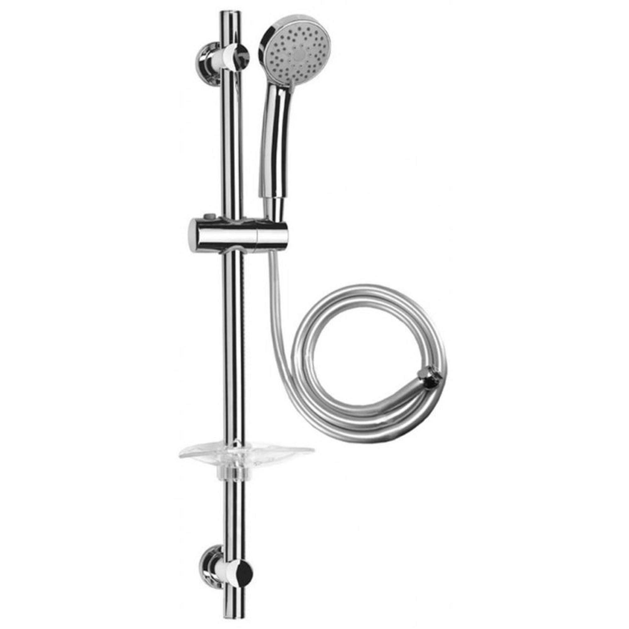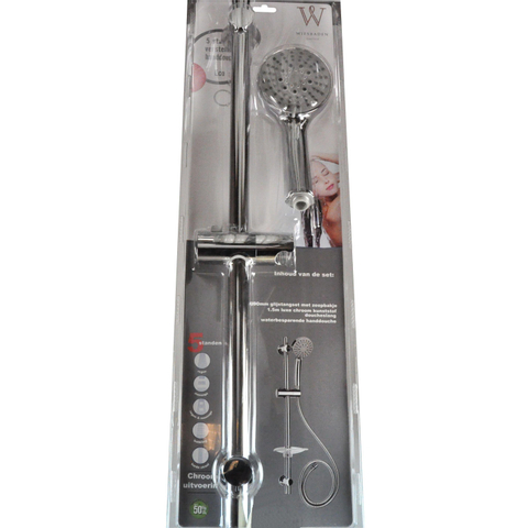 Glijstangset Chroom 5-standen handdouche met anti-kalk functie 1.5m chroom kunststof luxe doucheslang 690mm glijstang 580mm hart-afstand schroefgaten kunststof zeepschaaltje optionele waterbesparende doorstroombegrenzer bespaart tot 50% waterverbruik Universele conische 1/2" aansluitingen Inclusief bevestigingssschroeven en pluggen in blister chroom