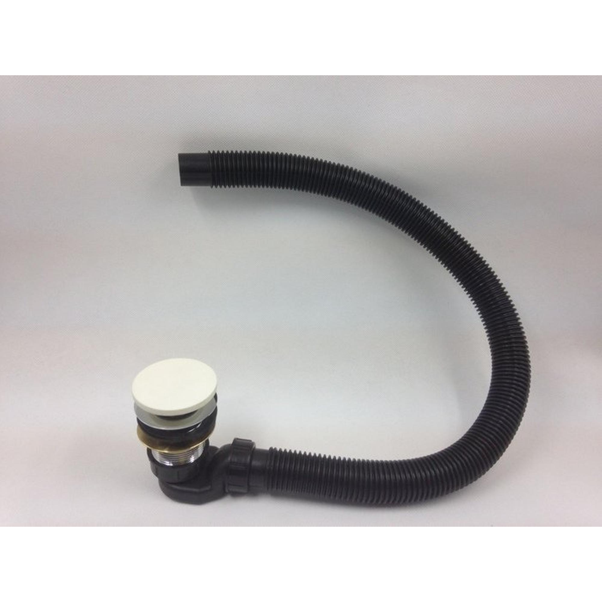 Badafvoer met klikwaste, messing afvoer en een wit Solid surface afdekplaatje.