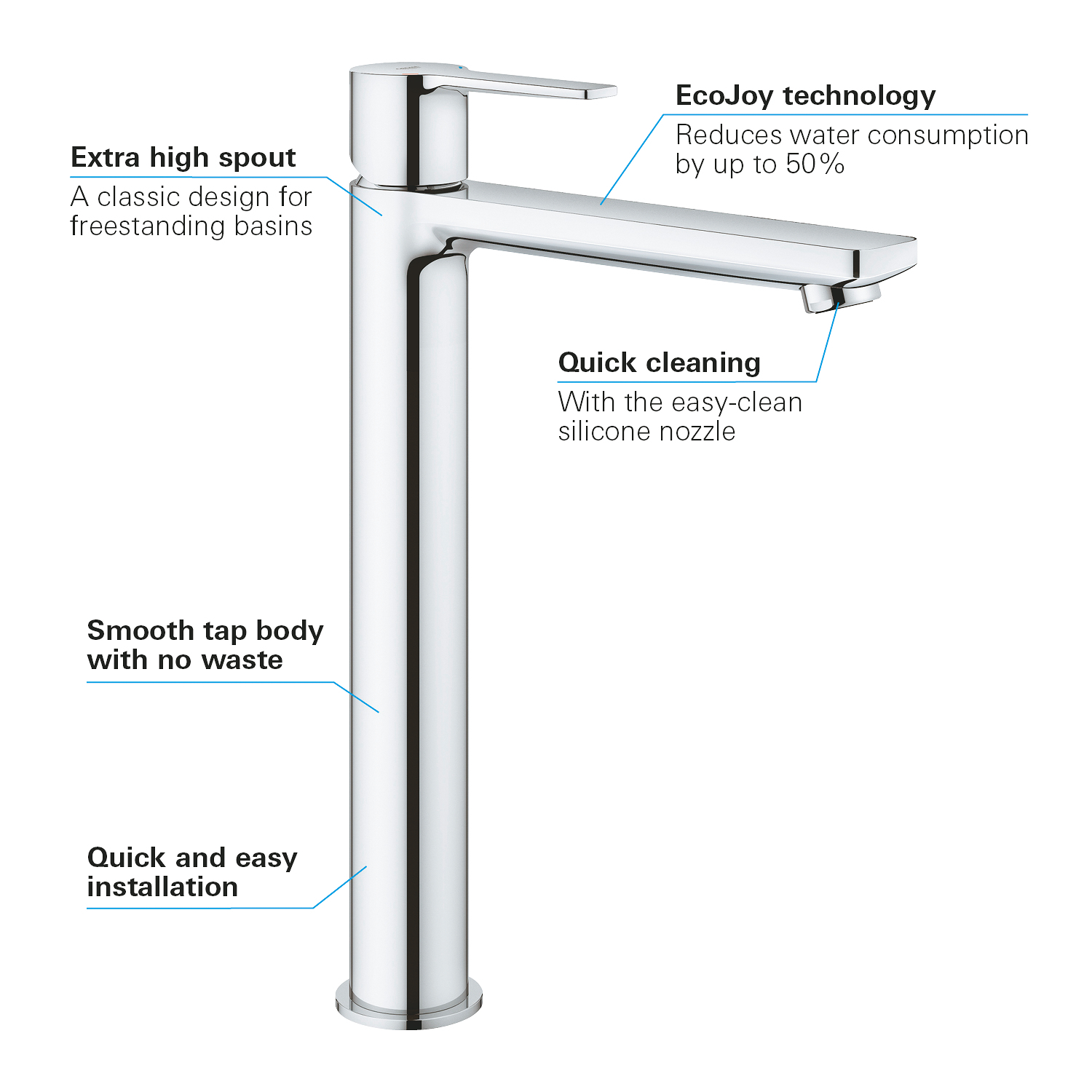 Elegantie en waterbesparende functies – de GROHE Lineare eengreeps wastafelmengkraan met extra hoge uitloop! De GROHE Lineare serie is zo ontworpen dat hij bij iedere vorm past en is gebaseerd op twee basisvormen – de cilinder en de rechthoek. We hebben deze twee vormen gecombineerd om een slanke kraan te creëren die prachtig past bij een minimalistisch design en zorgt voor cosmopolitische elegantie, maar dan in een modern jasje. De kraan nodigt uit tot aanraken en is een genot om te bedienen: GROHE Lineare heeft het allemaal.