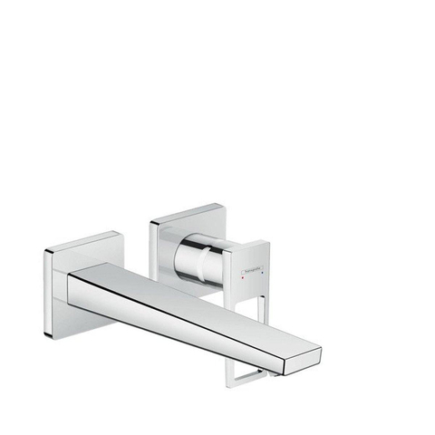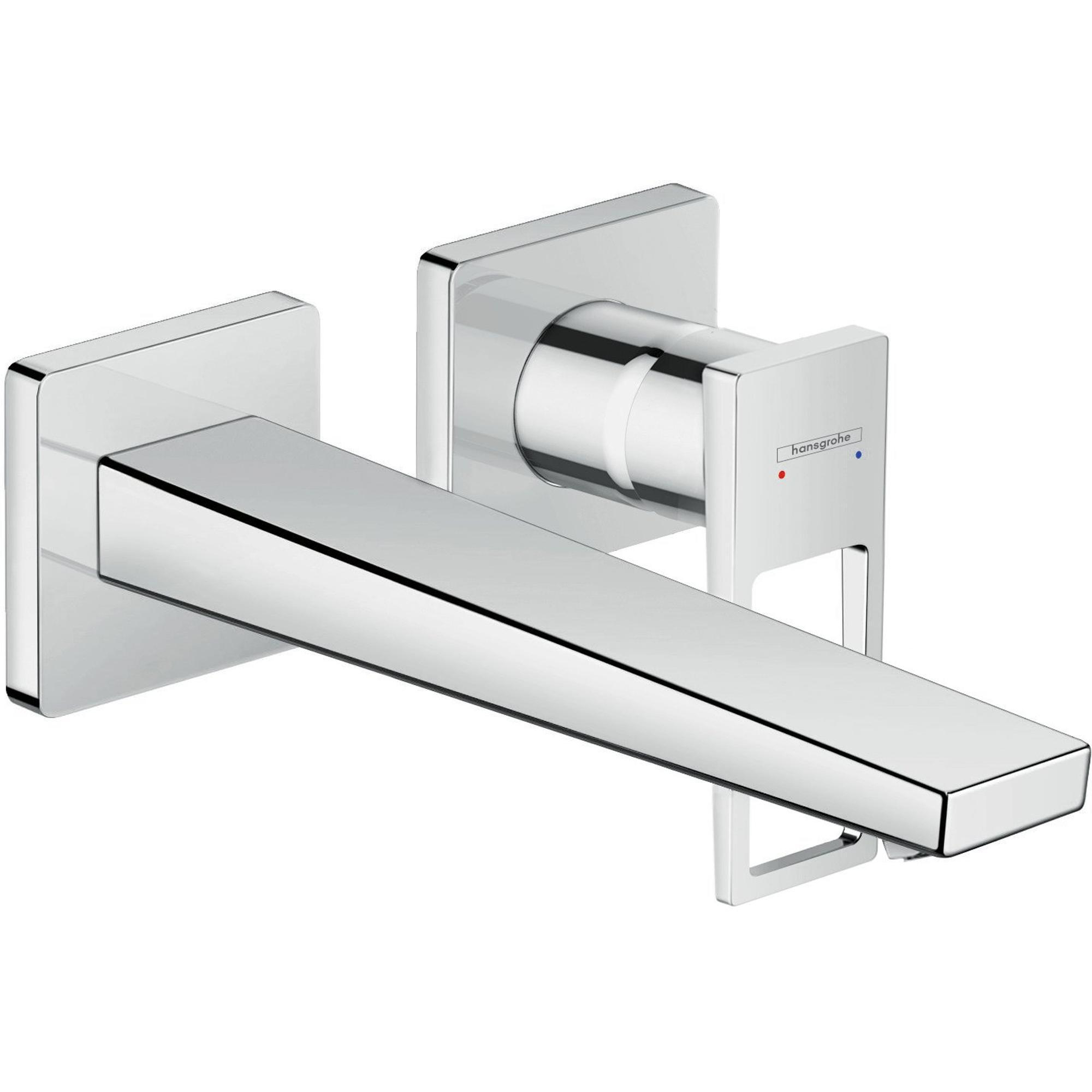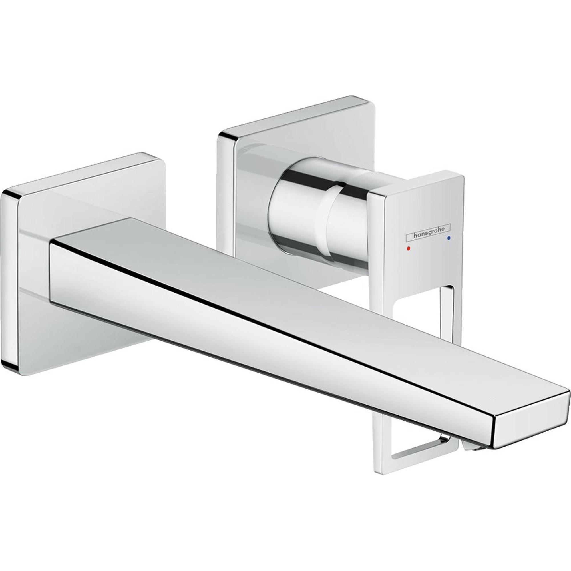 Bij deééngreeps inbouw wastafelmengkraan Metropol met beugelgreep en 225 mm lange uitloop voor wandmontage van hansgrohe verdwijnt de techniek onzichtbaar in de wand. Hij is dankzij zijn lange uitloop bijzonder geschikt voor vlakke wasbakken en maakt indruk met zijn hoekige vormen en geometrische silhouet. Het mengsysteem kan naar keuze links of rechts van de uitloop worden geplaatst.