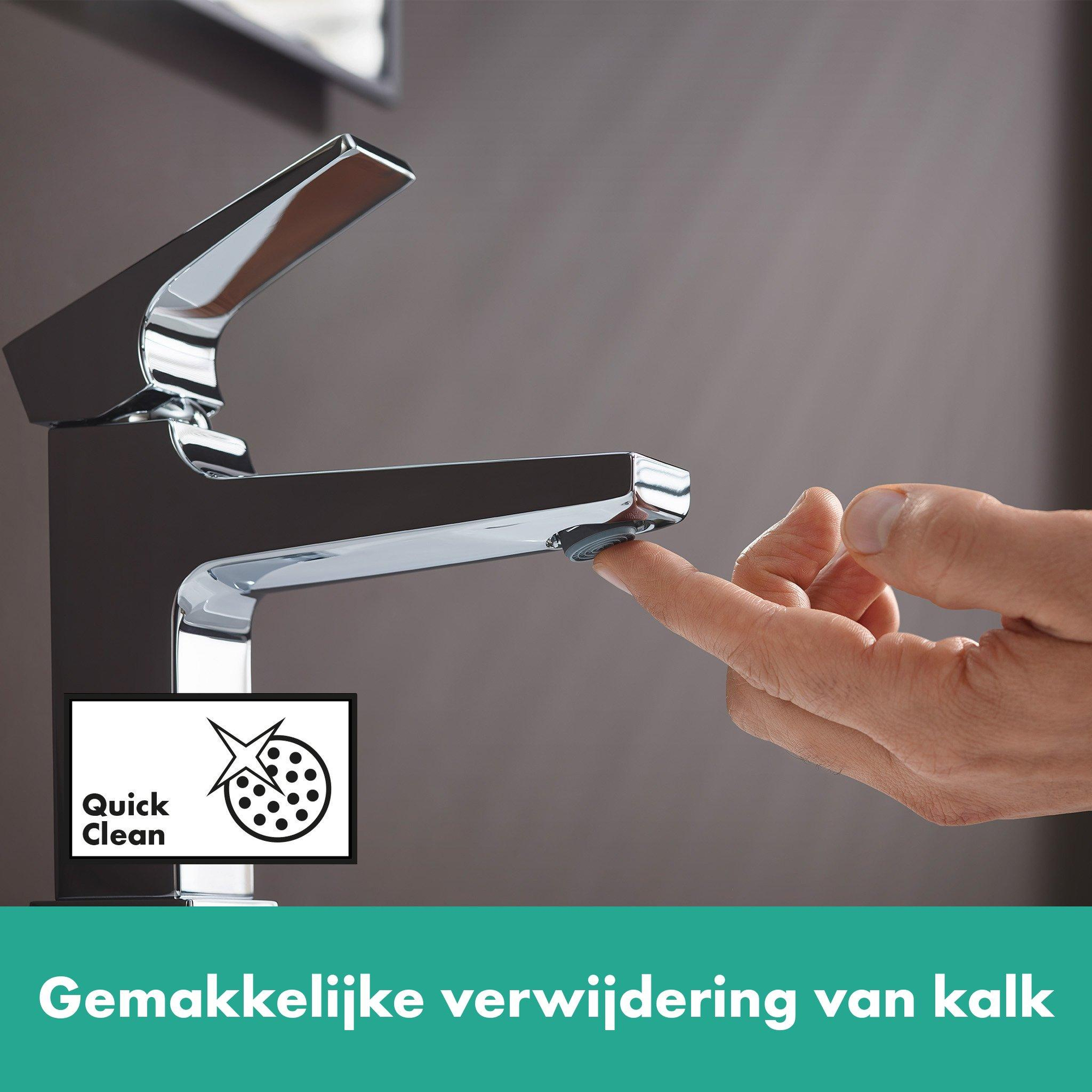 De Metropol 100 ééngreeps wastafelmengkraan met rechte greep en push-open afvoergarnituur maakt indruk met zijn uitgebreide oppervlakken en het geometrische design dat goed harmonieert met een moderne badkamersfeer. Dankzij de grote afstand tussen de uitloop en de wastafel ontstaat er meer ruimte voor veelzijdig gebruik, bijvoorbeeld voor het comfortabel wassen van de handen (ComfortZone 100).