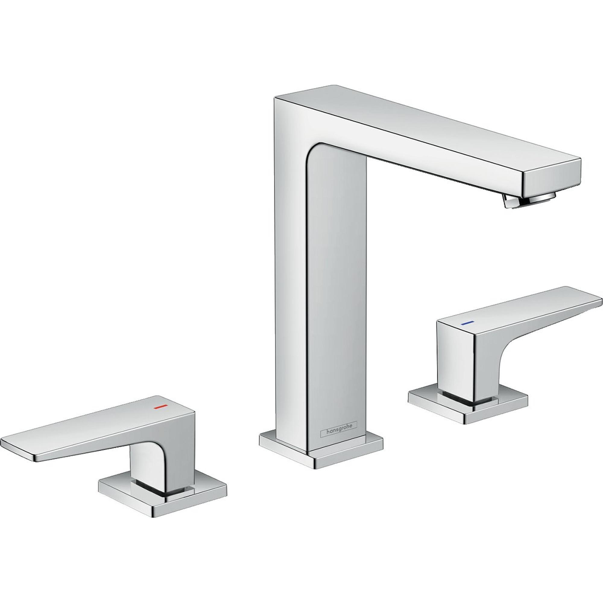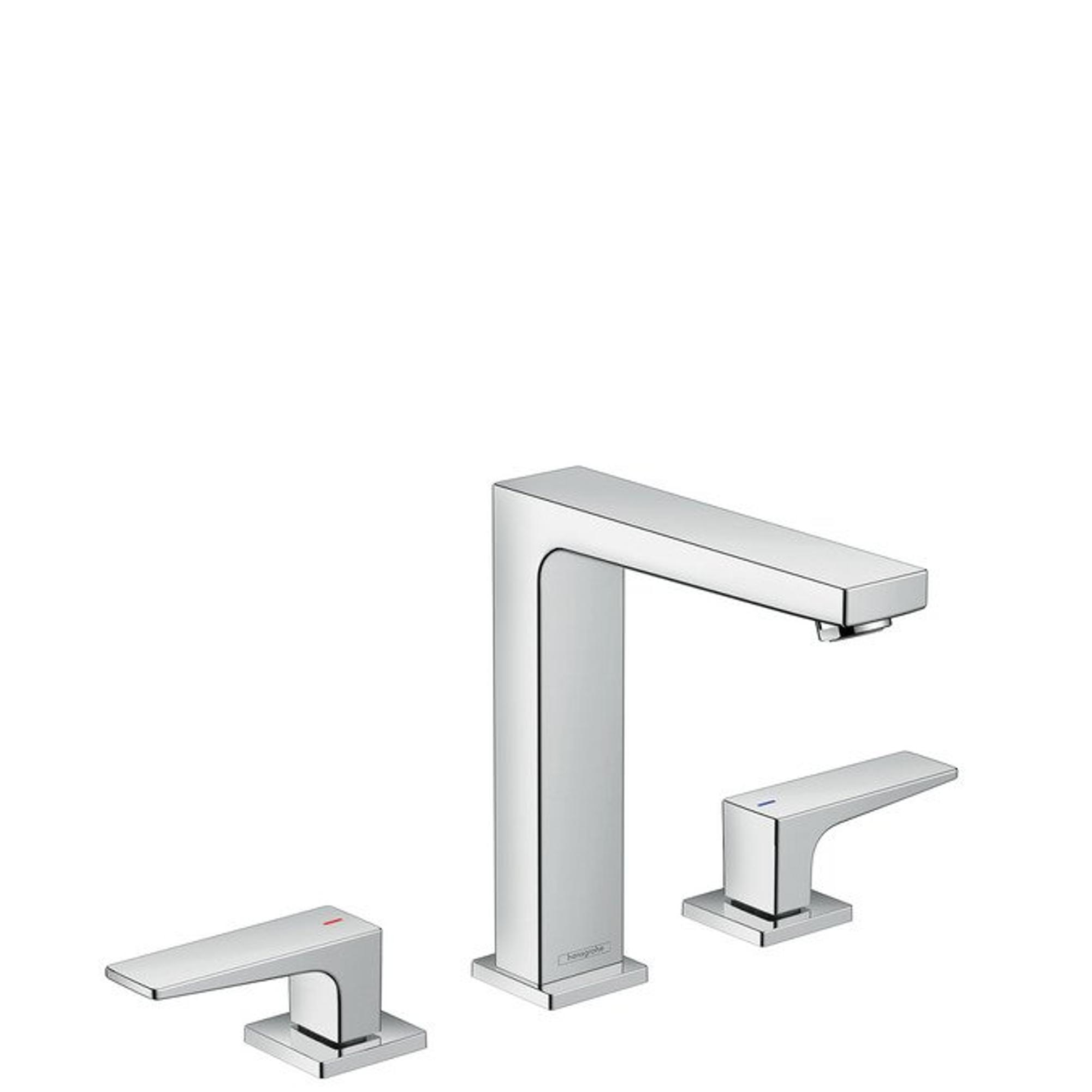 De 3-gats wastafelmengkraan Metropol 110 met beugelgrepen en PushOpen afvoergarnituur zet aan de wastafel een teken van ambitie en stijl. Het bedieningsconcept maakt gebruik van de klassieke tweegreepsbediening. Maar vorm en functie zijn door en door modern. door de zeer grote afstand tussen uit loop en wastafel ontstaat veel ruimte voor gemakkelijk gebruik, bijvoorbeeld voor haren wassen onder de waterkraan of het vullen van emmers (ComfortZone 160).