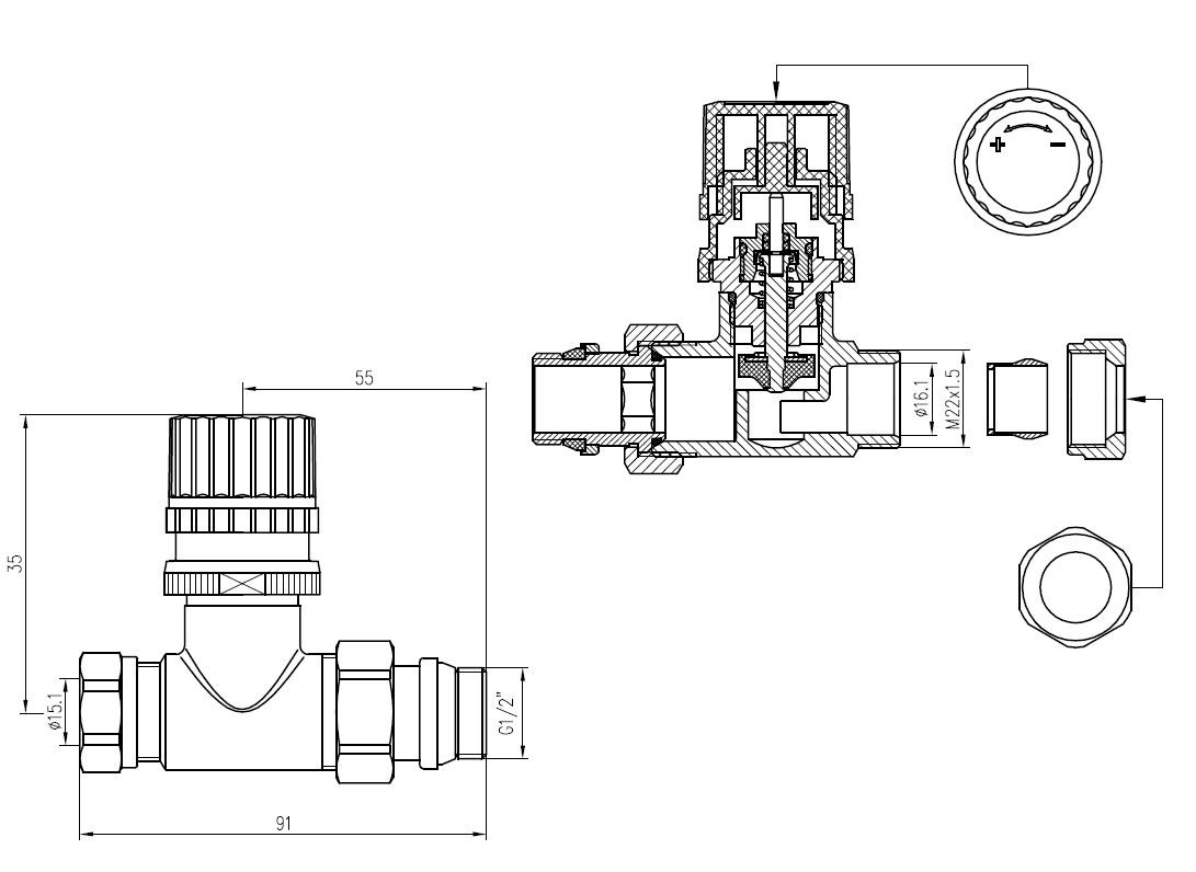 Riko luxe therm.voorber.vent.1/2''x15 (M22) knel recht chroom